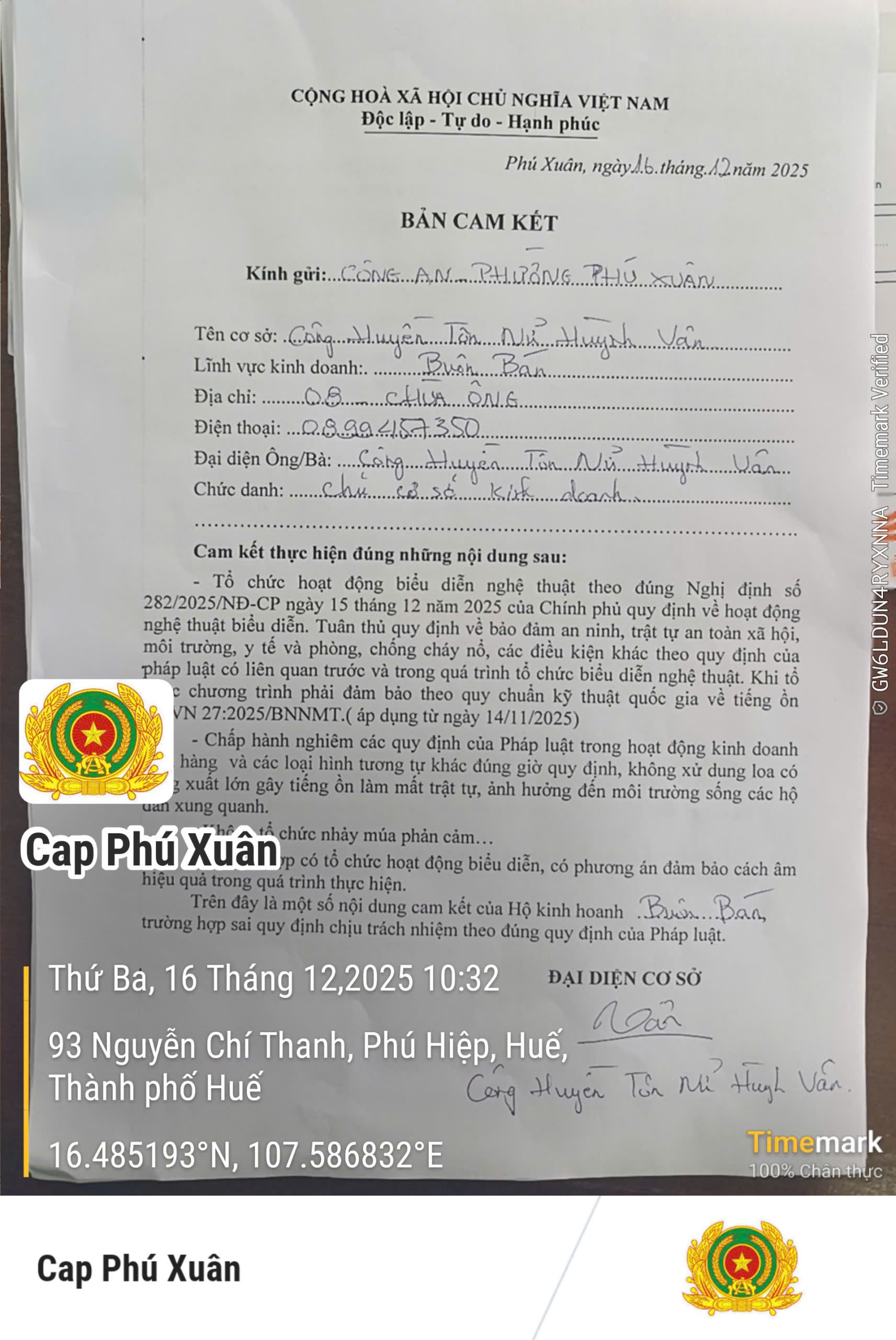 Sau khi nhận được phản ánh, UBND phường đã chỉ đạo Công an phường kiểm tra tại thực địa tiếp tục mời bà Công Huyền Tôn Nữ Huỳnh Vân đại diện cho hộ gia đình tại địa chỉ 06 Chùa Ông để làm việc. Tại buổi làm việc bà Vân cam kết thực hiện các quy định của nếp sống văn minh đô thị, trong đó cam đoan chấp hành việc không mở nhạc quá lớn và đúng thời gian quy định (đính kèm biên bản).
