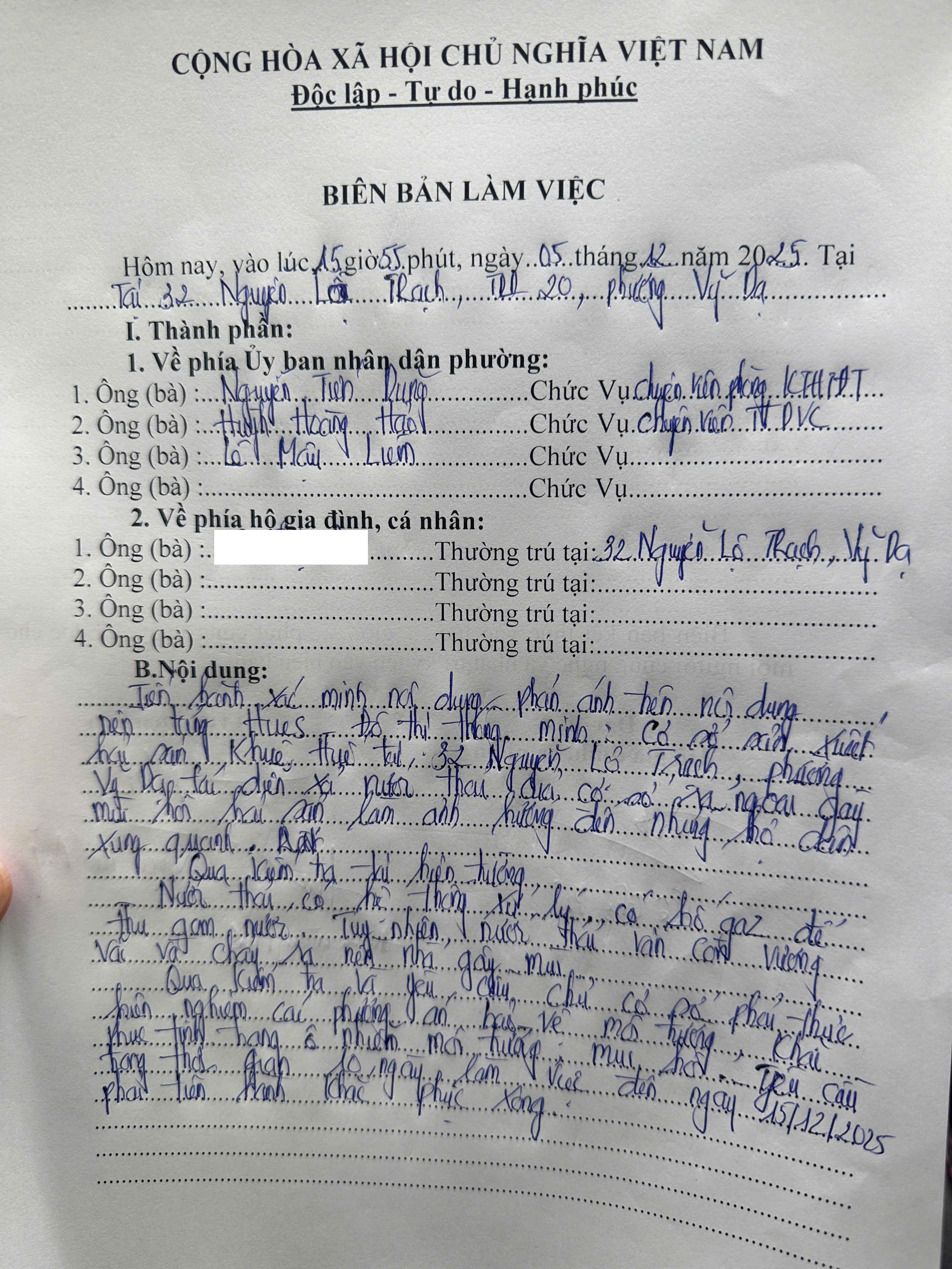 tiến hành kiểm tra nội dung phản ánh cơ sở sản xuất hải sản Khuê Huế tại 32 Nguyễn Lộ Trạch tái diễn xả nước thải của cơ sở ra ngoài gây mùi hôi hải sản làm ảnh hưởng đến những hộ dân xung quanh. Qua kiểm tra hiện trường nước thải có hệ thống xử lý, có hố ga để thu gom nước. Tuy nhiên nước thải vẫn còn vương vãi và chảy ra nền nhà gây mùi. Qua kiểm tra và yêu cầu chủ cơ sở phải thực hiện nghiêm các phương án bảo vệ môi trường, mùi hôi, yêu cầu trong thời gian 10 ngày làm việc đến ngày 15/12/2025 phải tiến hành khắc phục xong. (Đính kèm biên bản)