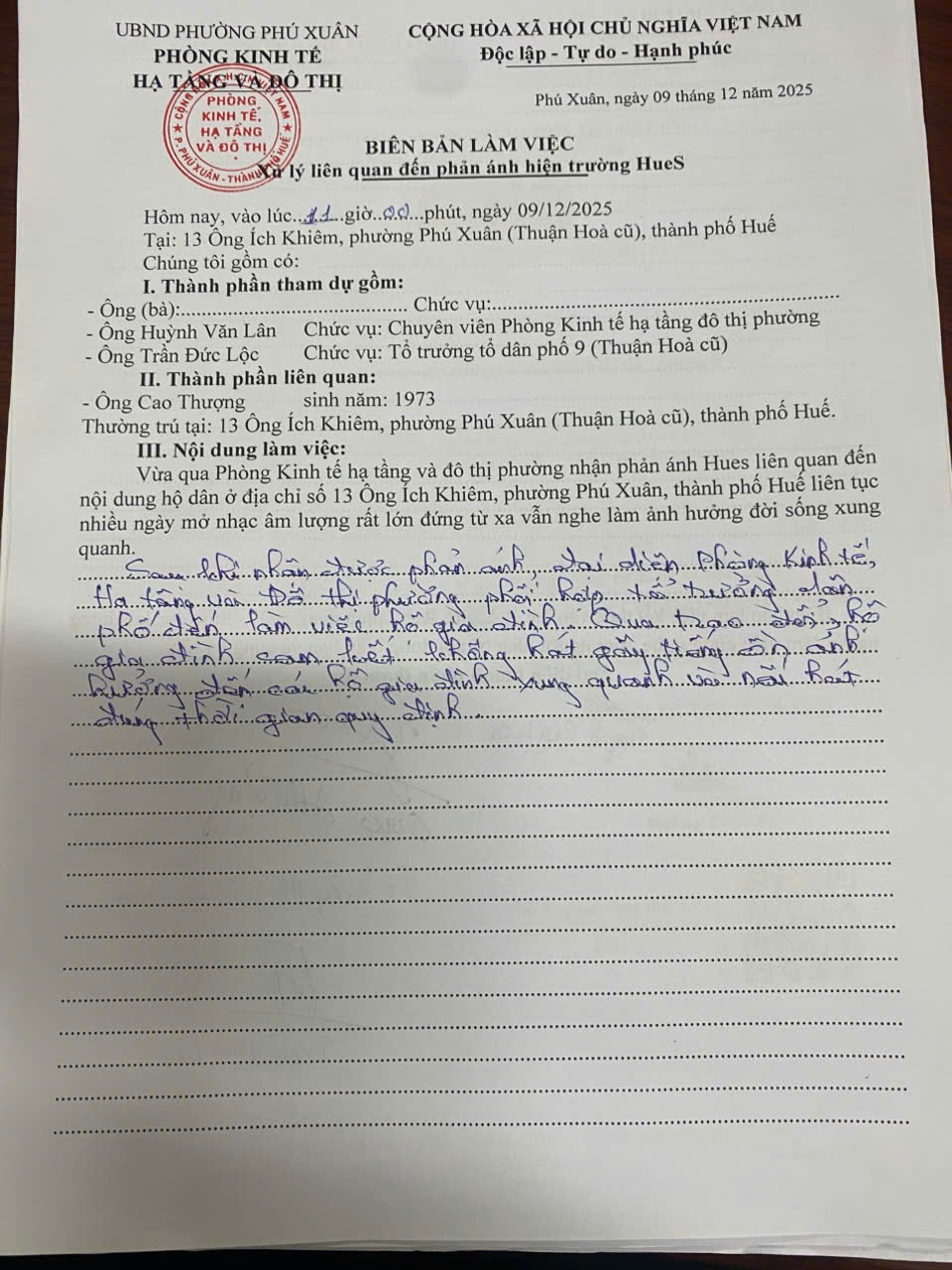 Phòng Kinh tế, Hạ tầng và Đô thị đã mời tổ trưởng TDP 9 Thuận Hòa và đại diện hộ gia đình tại địa chỉ 13 Ông Ích Khiêm làm việc. Qua trao đổi, hộ gia đình cam kết không hát gây tiếng ồn ảnh hưởng đến các hộ gia đình xung quanh. (đính kèm biên bản làm việc)