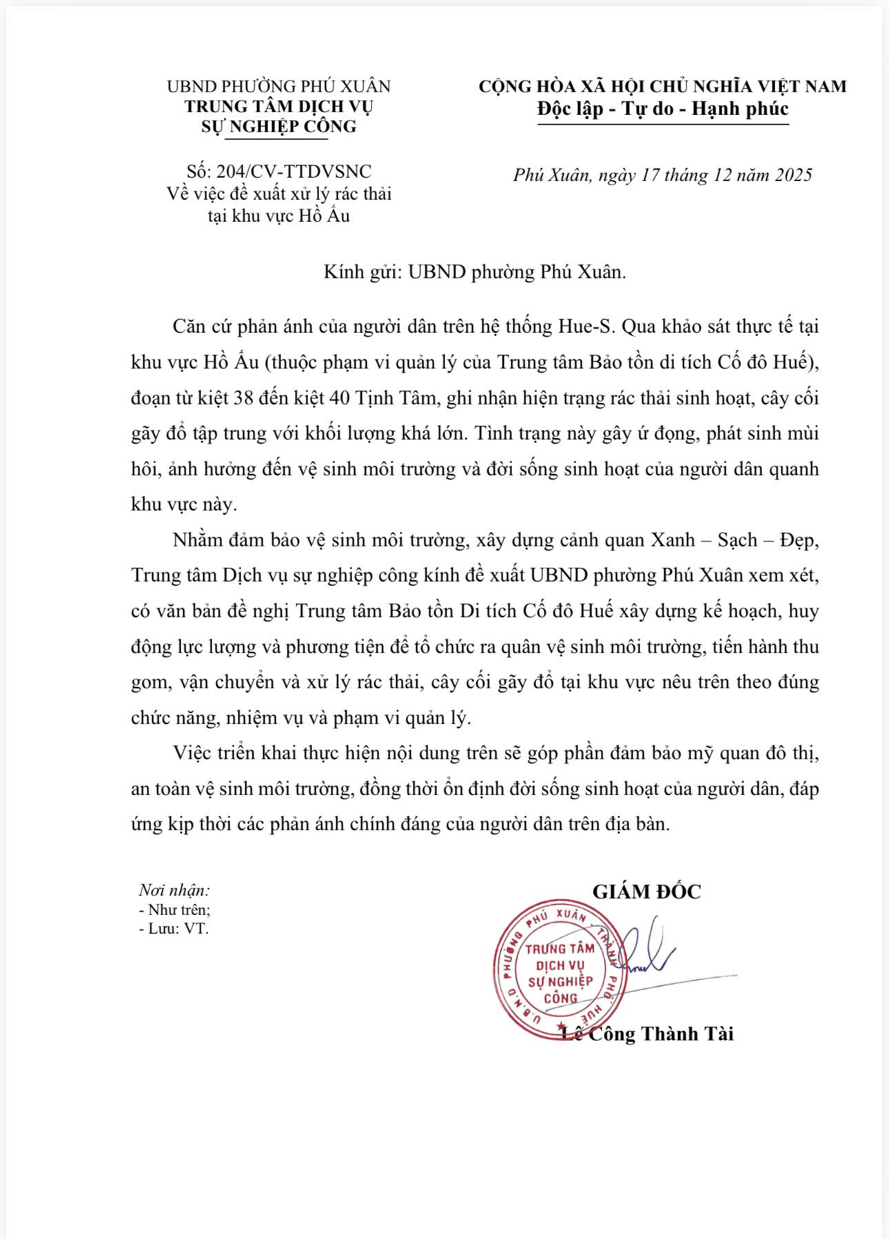Qua rà soát, khu vực Hồ Ấu thuộc phạm vi quản lý của Trung tâm Bảo tồn Di tích Cố đô Huế. Do đó, Trung tâm Dịch vụ sự nghiệp công đã có văn bản đề xuất UBND phường Phú Xuân xem xét, đồng thời có văn bản kiến nghị Trung tâm Bảo tồn Di tích Cố đô Huế xây dựng kế hoạch, huy động lực lượng và phương tiện để tổ chức ra quân vệ sinh môi trường, thu gom và xử lý rác thải, cây cối gãy đổ tại khu vực nêu trên, nhằm đảm bảo mỹ quan và vệ sinh môi trường (đính kèm văn bản đề xuất).