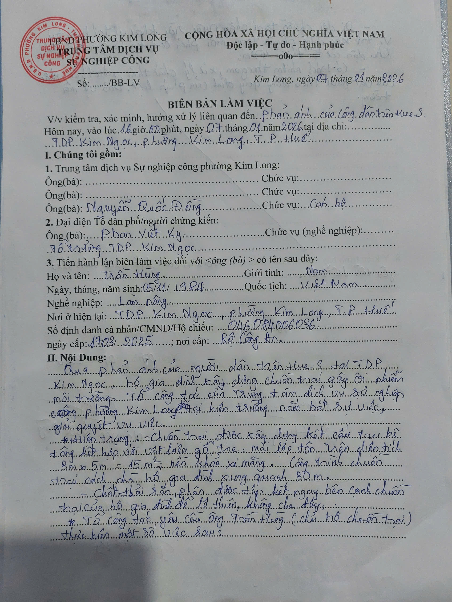 Vấn đề quý Ông/bà phản ánh, UBND phường Kim Long xin thông báo kết quả xử lý như sau: