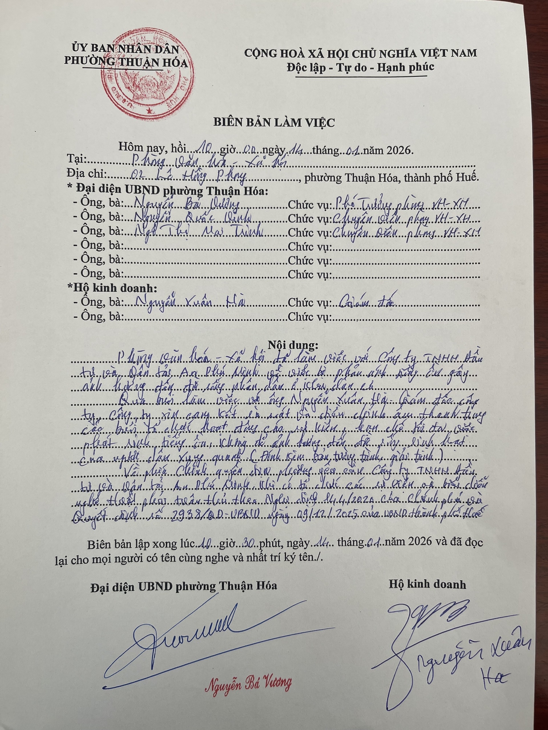 UBND phường Thuận Hoá có nhận được phản ánh về Trung tâm Times Square tổ chức hoạt động gây ô nhiễm tiếng ồn. UBND phường đã chỉ đạo Phòng VH-XH kiểm tra thực tế và mời Trung tâm Times Square lên làm việc. Tại buổi việc sau khi nghe Phòng VHXH trao đổi, trung tâm đã trình bày (có đơn kèm theo) và hứa sẻ khắc phục để không làm ảnh hưởng đến khu vực xung quanh. Phòng VHXH yêu cầu trung tâm phải chấp hành nghiêm quy định của pháp luật, nếu sai phạm sẻ bị xử lý theo quy định.