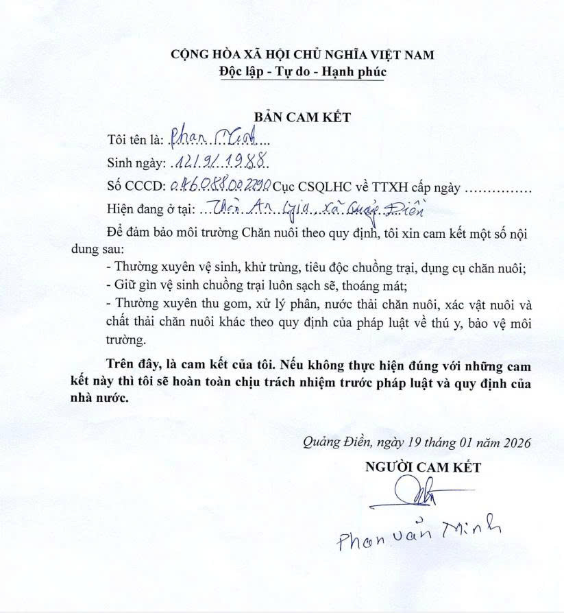 Sau khi tiếp nhận thông tin phản ánh, UBND xã Quảng Điền đã chỉ đạo Phòng Kinh tế xã cùng với Trưởng thôn An Gia tiến hành kiểm tra, xử lý nội dung phản ánh của công dân. Tại vị trí mà Ông (Bà) phản ánh là hộ gia đình ông Phan Văn Minh có chăn nuôi Bò trong khu dân cư chưa đảm bảo vệ sinh môi trường; UBND xã đã chỉ đạo Phòng Kinh tế xã cùng với Trưởng thôn An Gia tiến hành làm việc, cho chủ hộ gia đình cam kết thực hiện các biện pháp đảm bảo vệ sinh môi trường chăn nuôi và tiến hành theo dõi quá trình khắc phục, tham mưu xử lý nếu còn tiếp tục để xảy ra ô nhiễm môi trường chăn nuôi đối với hộ ông Phan Văn Minh (có Biên bản làm việc và Bản cam kết kèm theo).