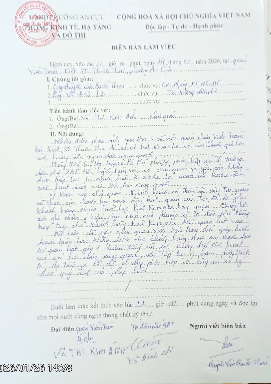 Phòng Kinh tế, hạ tầng và Đô thị Phường An Cựu phối hợp tổ dân phố 9AT tiến hành lập biên bản nhắc nhở đối với Chủ quán Vườn Tràm ( Có biên bản kèm theo )
