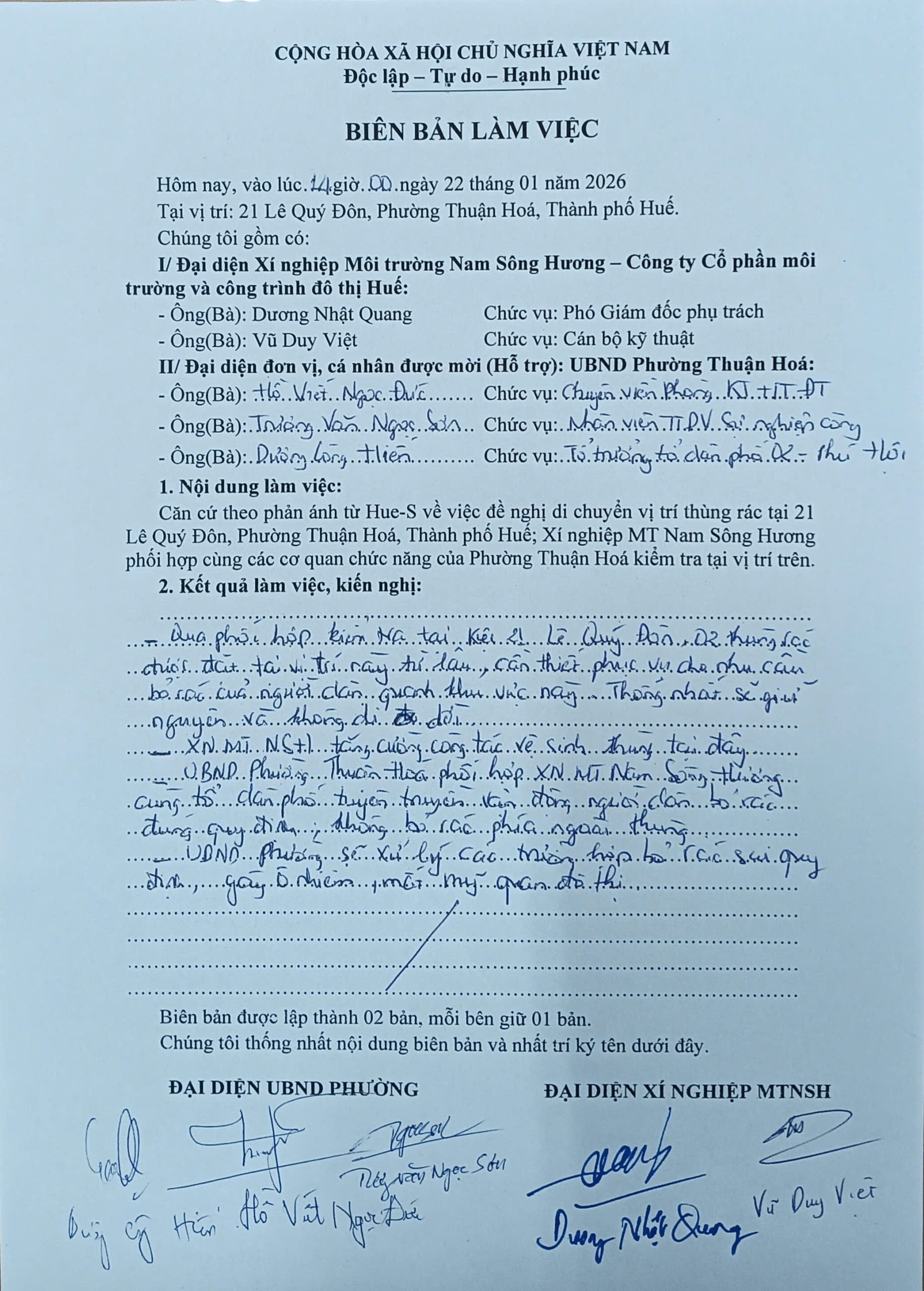 Sau khi nhận được phản ánh, Công ty đã phối hợp cùng đại diện UBND phường Thuận Hóa, tổ trưởng tổ dân phố 2 Phú Hội cũ kiểm tra và xác định vị trí thùng rác là cần thiết để các hộ dân trong liệt 21 Lê Quý Đôn và xung quanh bỏ rác; thống nhất không di dời 02 thùng rác này. Để đảm bảo vệ sinh, UBND phường Thuận Hóa và tổ trưởng tổ dân phố sẽ tăng cường tuyên truyền đến các hộ dân bỏ rác đúng nơi và đúng giờ quy đinh (sau 17h00); Công ty sẽ tăng cường vệ sinh thùng tại vị trí phản ánh (Đính kèm biên bản).