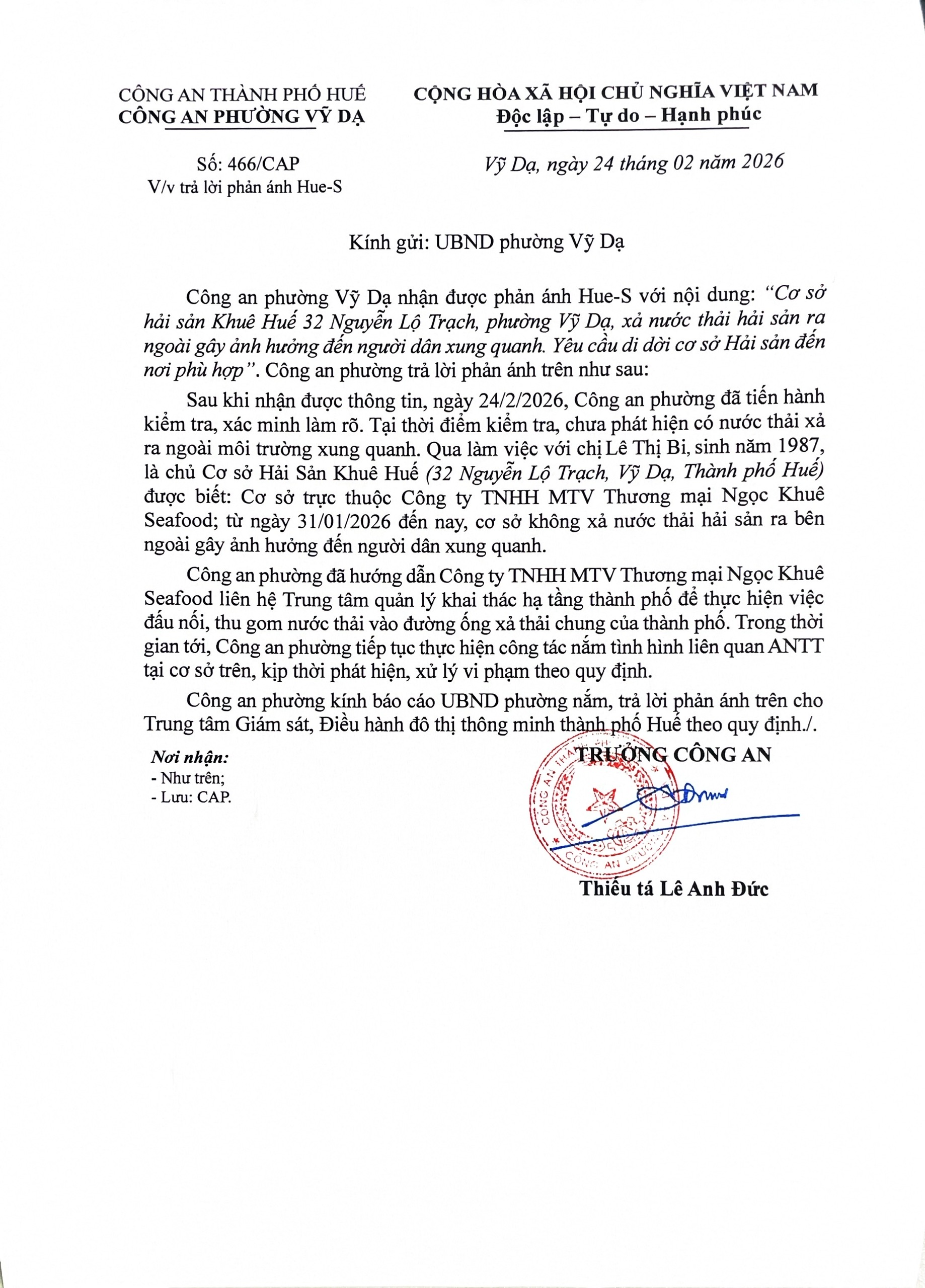 Sau khi tiếp nhận phản ánh, UBND phường Vỹ Dạ đã chỉ đạo Công an phường tiến hành kiểm tra, xác minh làm rõ. Tại thời điểm kiểm tra, chưa phát hiện có nước thải xả ra ngoài môi trường xung quanh. Qua làm việc với Bà L.T.B sinh năm 1987 là chủ cơ sở được biết: Cơ sở trực thuộc Công ty TNHH MTV Thương mại Ngọc Khuê Seafood; từ ngày 31/01/2026 đến nay cơ sở không xả thải nước hải sản ra bên ngoài gây ảnh hưởng đến gnuoiwf dân xung quanh.