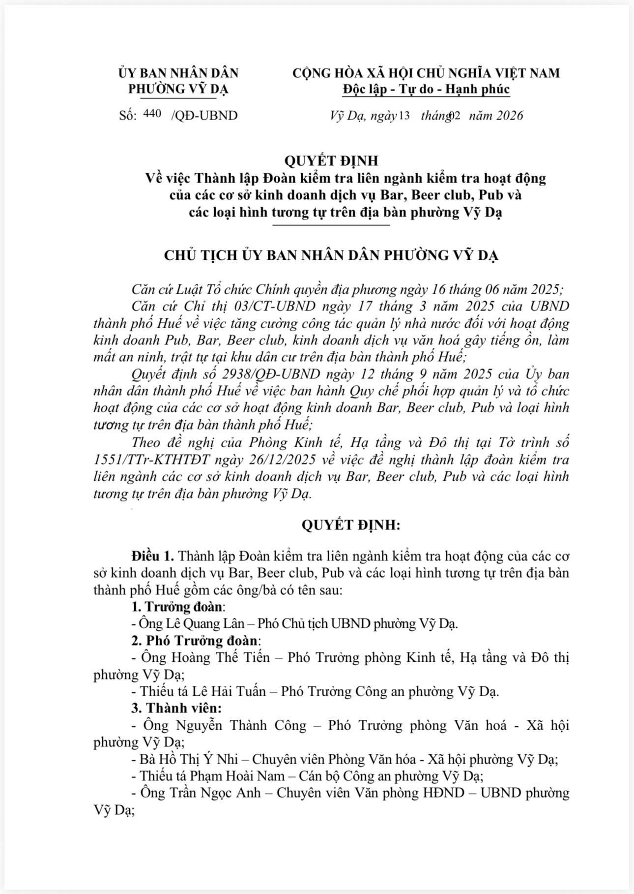 - Sau khi tiếp nhận phản ánh lần 2, liên quan đến việc gây tiếng ồn lúc 23:34 ngày 6/2/2026, Phòng Kinh tế, Hạ tầng và Đô thị phường Vỹ Dạ đã liên hệ nhắc nhở Chủ cơ sở, đồng thời tham mưu UBND phường Vỹ Dạ thành lập đoàn kiểm tra liên ngành kiểm tra hoạt động của các cơ sở kinh doanh Dịch vụ Bar, Beer club, Pub và các loại hình tương tự trên địa bàn phường Vỹ Dạ (Quyết định số 440/QĐ-UBND ngày 13/02/2026 của UBND phường Vỹ Dạ). Qua đó thời gian tới, UBND phường Vỹ Dạ sẽ phối hợp các đơn vị liên quan tiến hành kiếm tra việc thực hiện các quy định của pháp luật của các cơ sở hoạt động kinh doanh Bar, Beer club, Pub, kinh doanh dịch vụ văn hoá gây tiếng ồn, làm mất an ninh, trật tự tại khu dân cư trên địa bàn phường. (Đính kèm quyết định)