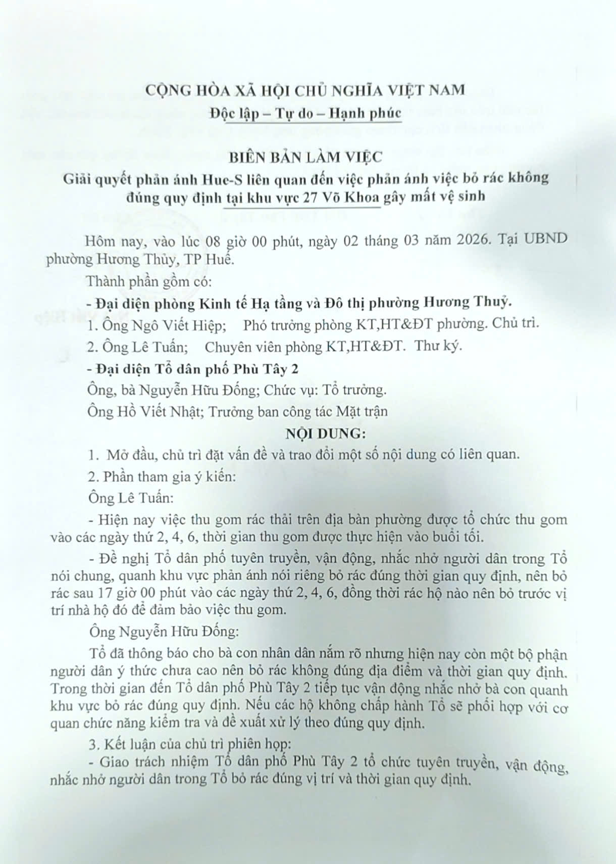 Qua kiểm tra và tại phiên làm việc ngày 02/3/2026, Phòng Kinh tế, Hạ tầng và Đô thị phường đã đề nghị Tổ dân phố Phù Tây 2 tiếp tục theo dõi, nhắc nhở, nghiêm cấm các hộ dân tại khu vực có hành vi bỏ rác không đúng địa điểm, thời gian quy định. Đồng thời, đề nghị Tổ dân phố tích cực vận động bà con nhân dân thường xuyên tiến hành ra quân làm vệ sinh môi trường, thu gom xử lý rác thải hưởng ứng "Ngày Chủ nhật xanh" góp phần làm môi trường xung quanh được xanh, sạch, đẹp, an toàn. (Đính kèm biên bản làm việc)