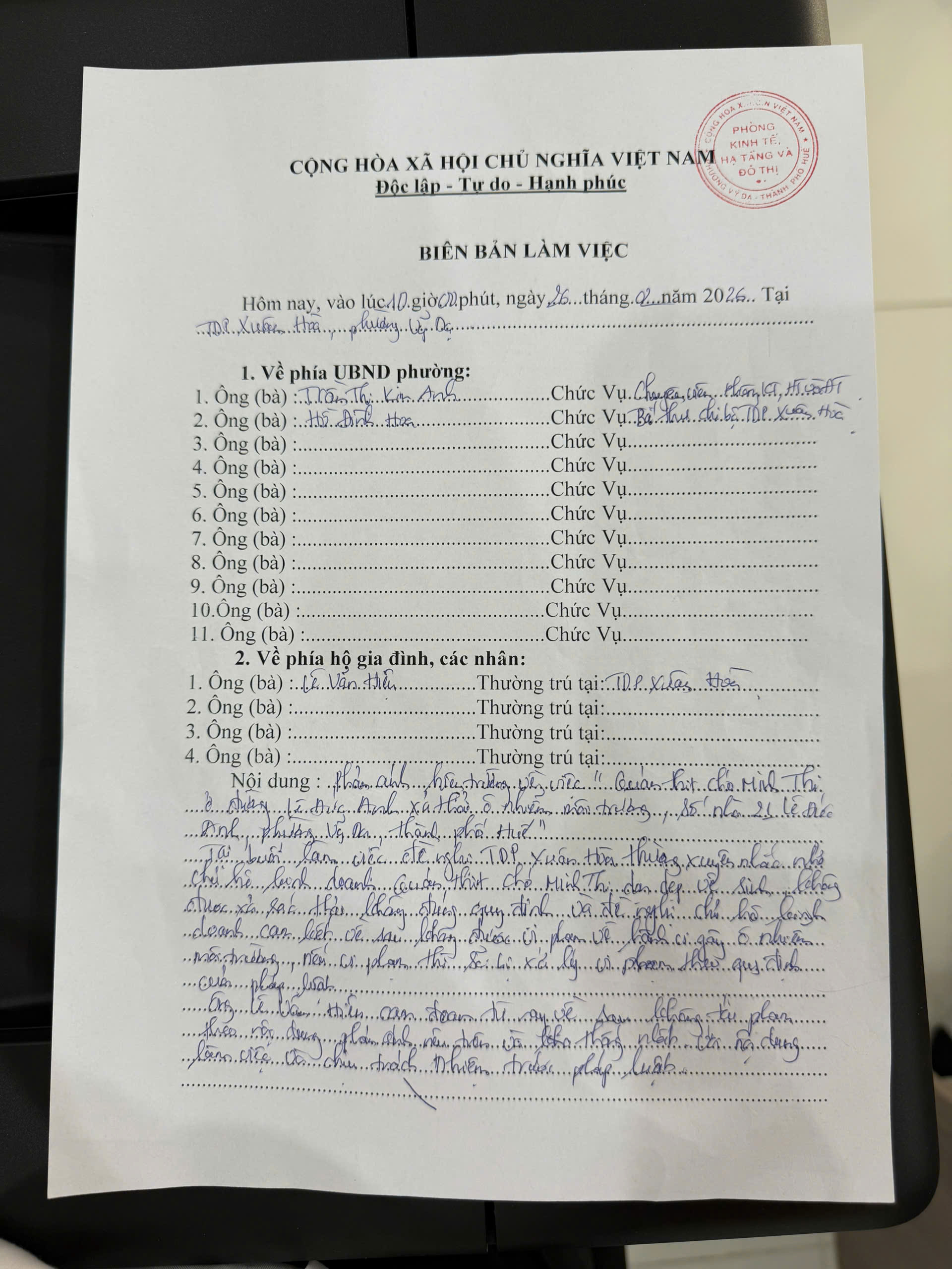 UBND phường đã giao Phòng Kinh tế, Hạ tầng và Đô thị tiến hành kiểm, xử lý. Tại buổi làm việc của Phòng đề nghị tổ dân phố Xuân Hòa thường xuyên tuyên truyền nhắc nhở hộ kinh doanh dọn dẹp vệ sinh, không để xả rác, nước thải không đúng quy định và đề nghị chủ hộ kinh doanh cam kết về sau không được vi phạm hành vi gây ô nhiễm môi trường, nếu vi phạm sẽ xử lý theo quy định của pháp luật. Ông H chủ cơ sở cam đoan không tái phạm nội dung phản ánh trên và thống nhất nội dung làm việc và chịu trahcs nhiệm trước pháp luật (Đính kèm biên bản)