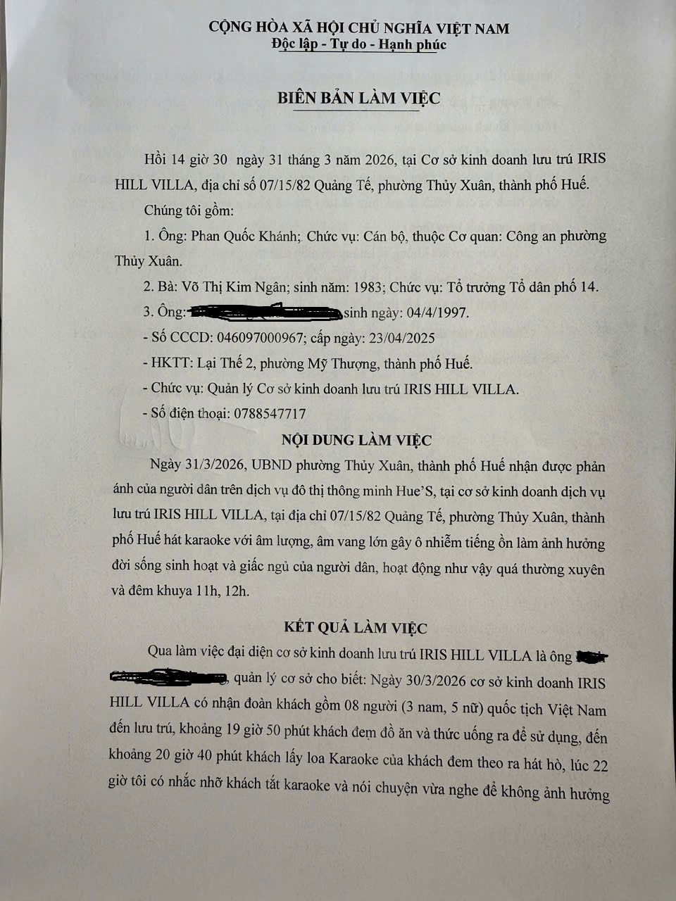 Công an phường Thuỷ Xuân (TP Huế) đã phối hợp với tổ trưởng Tổ dân phố 14 phường Thuỷ Xuân tiến hành kiểm tra thực tế và làm biên bản làm việc đối với ông Đ.C.Q.P là người quản lý Cơ sở kinh doanh IRIS HILL VILLA. Theo trình bày của ông Đ.C.Q.P vào ngày 30/3/2026 cơ sở kinh doanh IRIS HILL VILLA có nhận đoàn khách gồm 08 người quốc tịch Việt Nam đến lưu trú, khoản 19 giờ 50 phút khách đem đồ ăn và thức uống ra để sử dụng, đến 20 giờ 40 phút khách lấy loa Karaoke của khách đem ra hát hò, lúc 22 giờ tôi đã nhắc nhỡ khách tắt karaoke và nói chuyện vừa nghe để không làm ảnh hưởng đến người dân xung quanh khu phố, khoản 22 giờ 45 phút khách vẫn còn hát, đến khoản 22 giờ 50 Tổ công tác Công an phường Thuỷ Xuân đến làm việc và yêu cầu khách ngừng hát.(có biên bản làm việc và bản cam đoan-cam kết kèm theo).
