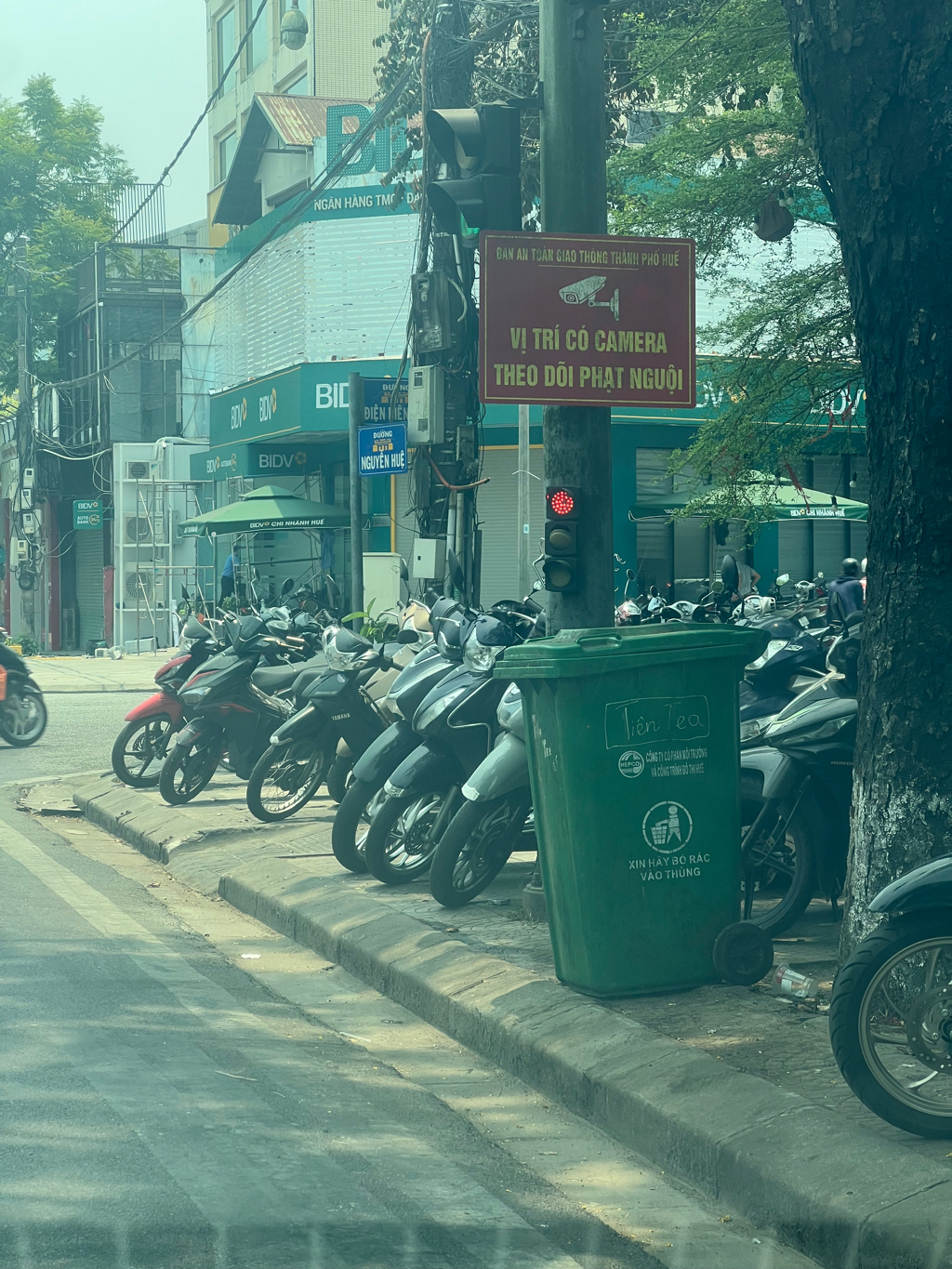 Tại đèn đỏ ngã tư Nguyễn Huệ - Điện Biên Phủ, thùng rác của hộ kinh doanh đặt cố định trái phép tại khu vực vỉa hè, chắn ngang lối đi bộ qua đường và biến thành nơi tập kết rác thải, gây mất mỹ quan. Kính mong chính quyền xử lý. Ảnh chụp lúc 11h sáng ngày 20/4/2026.