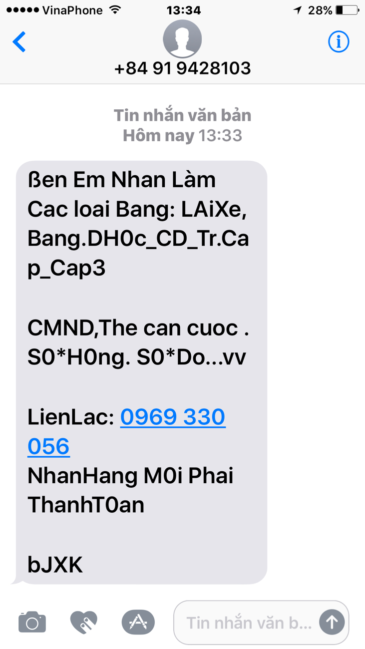 - Tin nhắn với mục đích lừa đảo, quấy rối hoặc phát tán virus máy tính, phần mềm gây hại hoặc gửi các thông tin độc hại như lừa đảo, chống phá Nhà nước, kích động bạo lực.