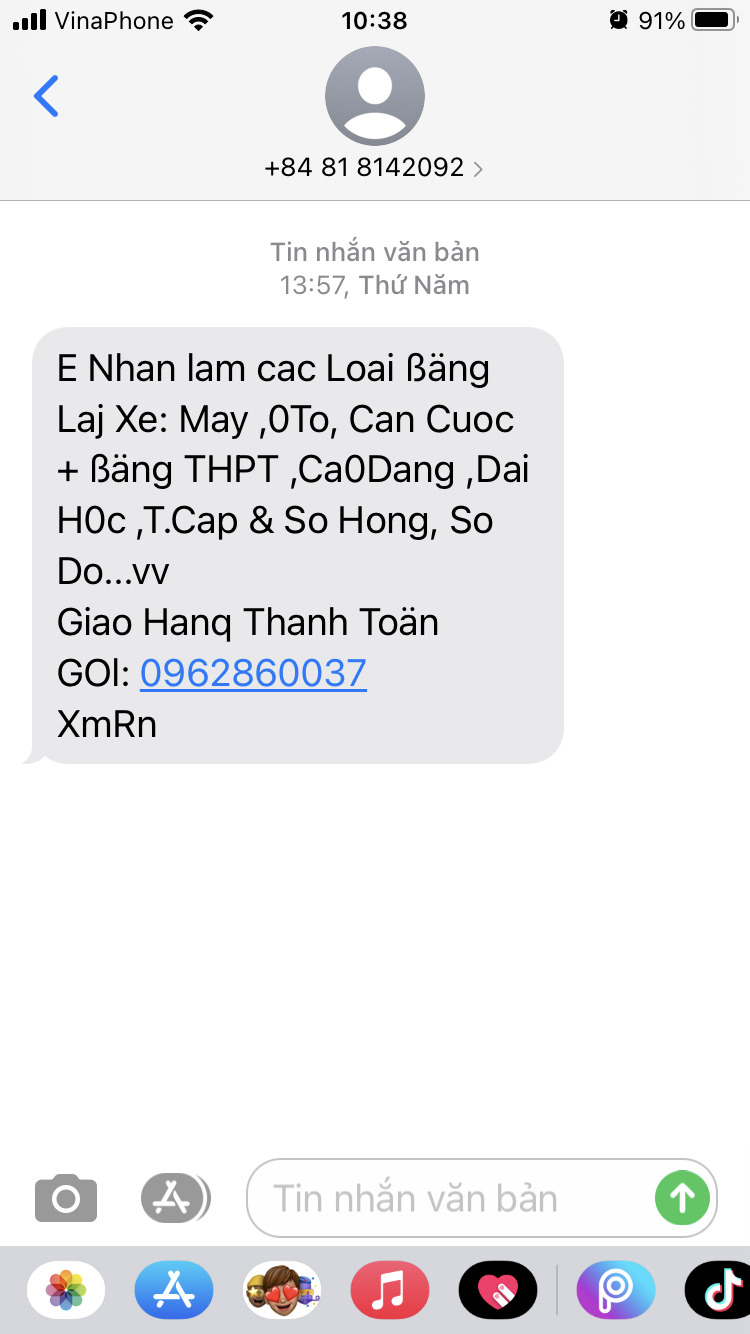 Đây là một vài tin nhắn có nội dung lừa đảo dụ dỗ mua bán các loại bằng cấp, giấy tờ giả. Đề nghị cơ quan chức năng có biện pháp xử lý.