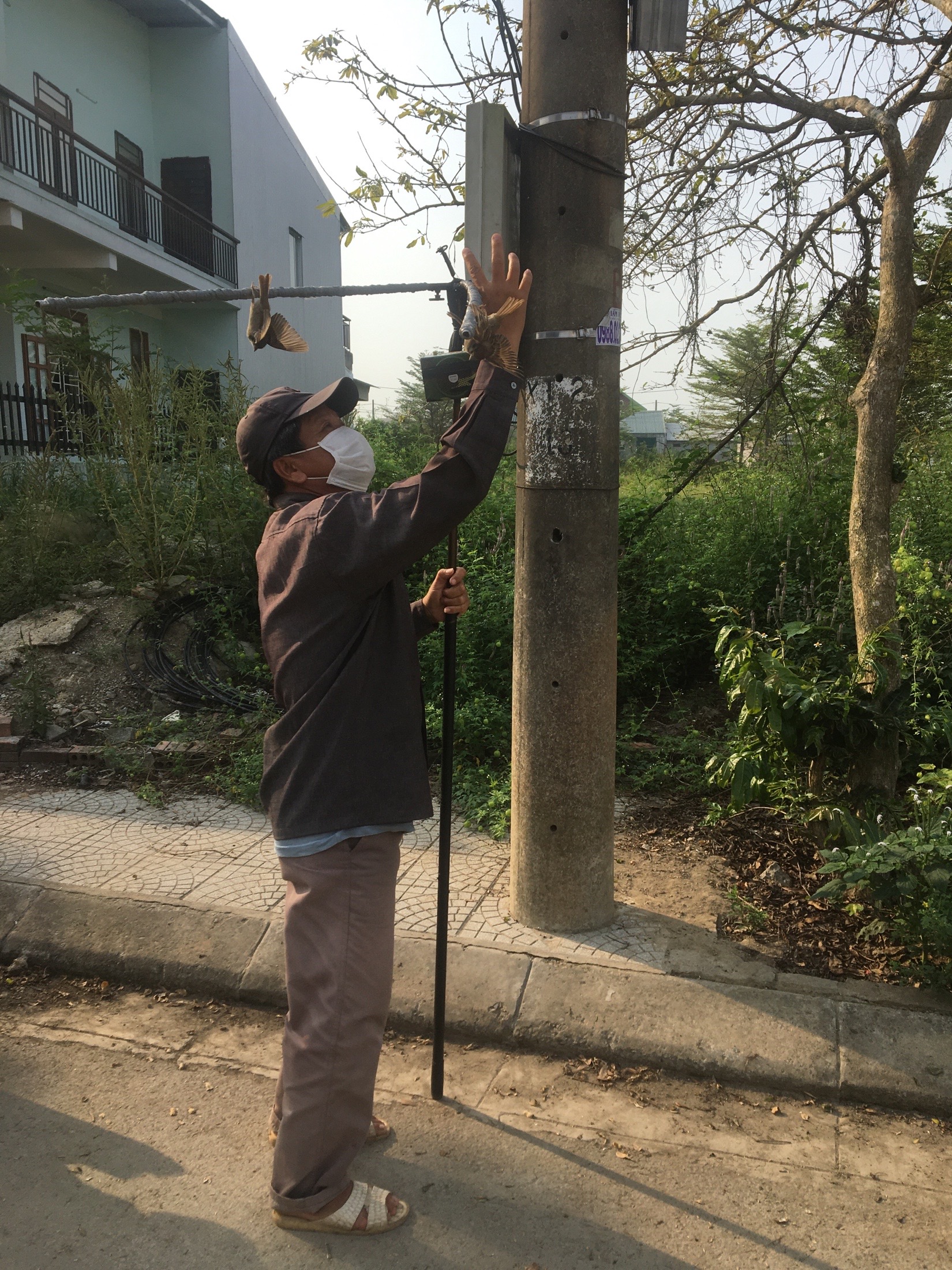 Hiện tượng bắt chim bằng bẫy keo và âm thanh. Tại Khu Quy hoạch Ân Nam, TDP Thanh Chữ, Hương An, Hương Trà, Thừa Thiên Huế, ảnh chụp vào lúc 7h30 ngày 23/4/2021. Kính gửi cơ quan chức năng xử lý.