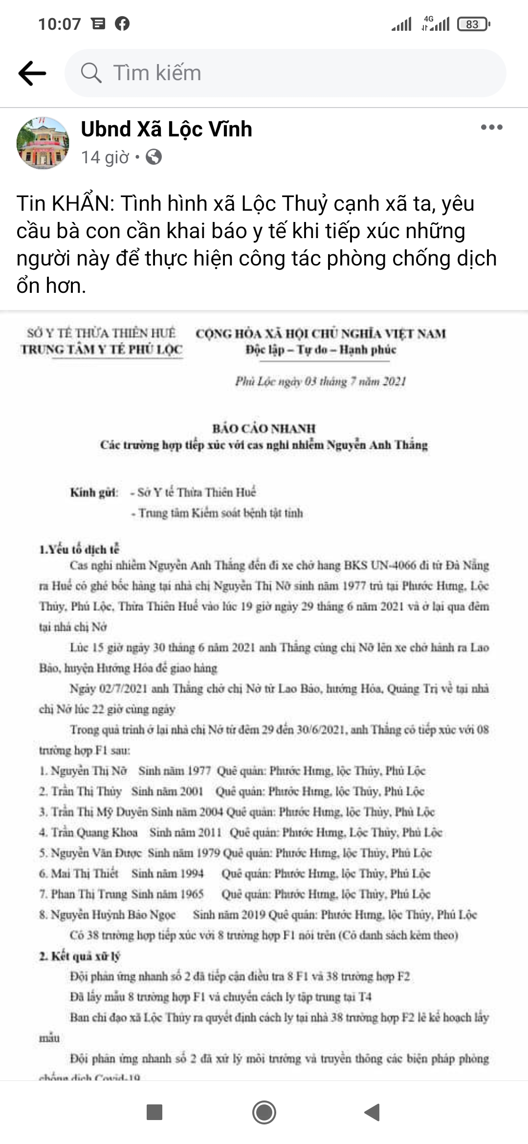 1. Tài khoản Facebook UBND xã Lộc Vĩnh đăng tải nội dung báo cáo nhanh của Trung tâm y tế huyện Phú Lộc, qua trao đổi với admin thì được biết mục đích đăng bài để thông tin cho nhân dân xã Lộc Vĩnh biết để thực hiện việc khai báo y tế.