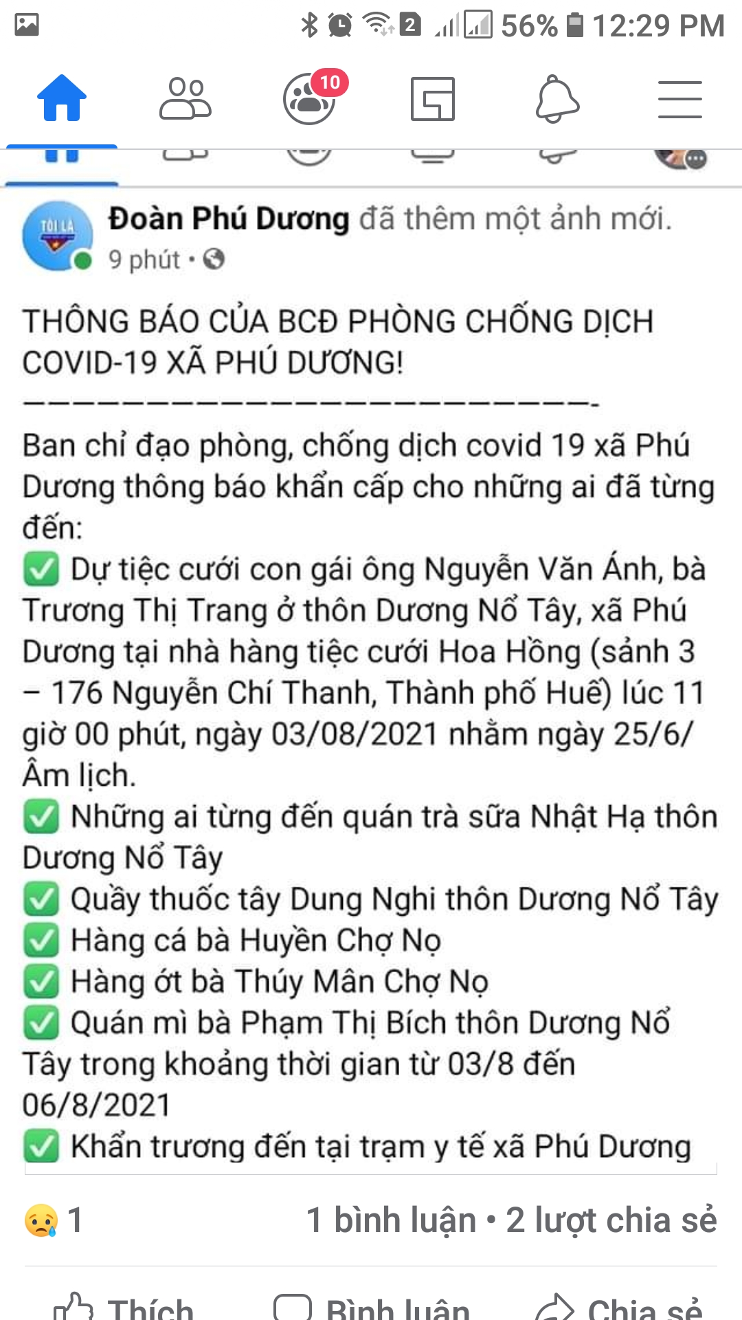 2. Việc đăng tải nội dung thông báo của BCĐ phòng, chống dịch Covid-19 xã Phú Dương “Thông báo khẩn cấp cho những ai đã từng đến dự tiệc cưới …” với mục đích truy vết F2 theo chỉ đạo của BCĐ phòng, chống dịch Covid-19 xã Phú Dương.