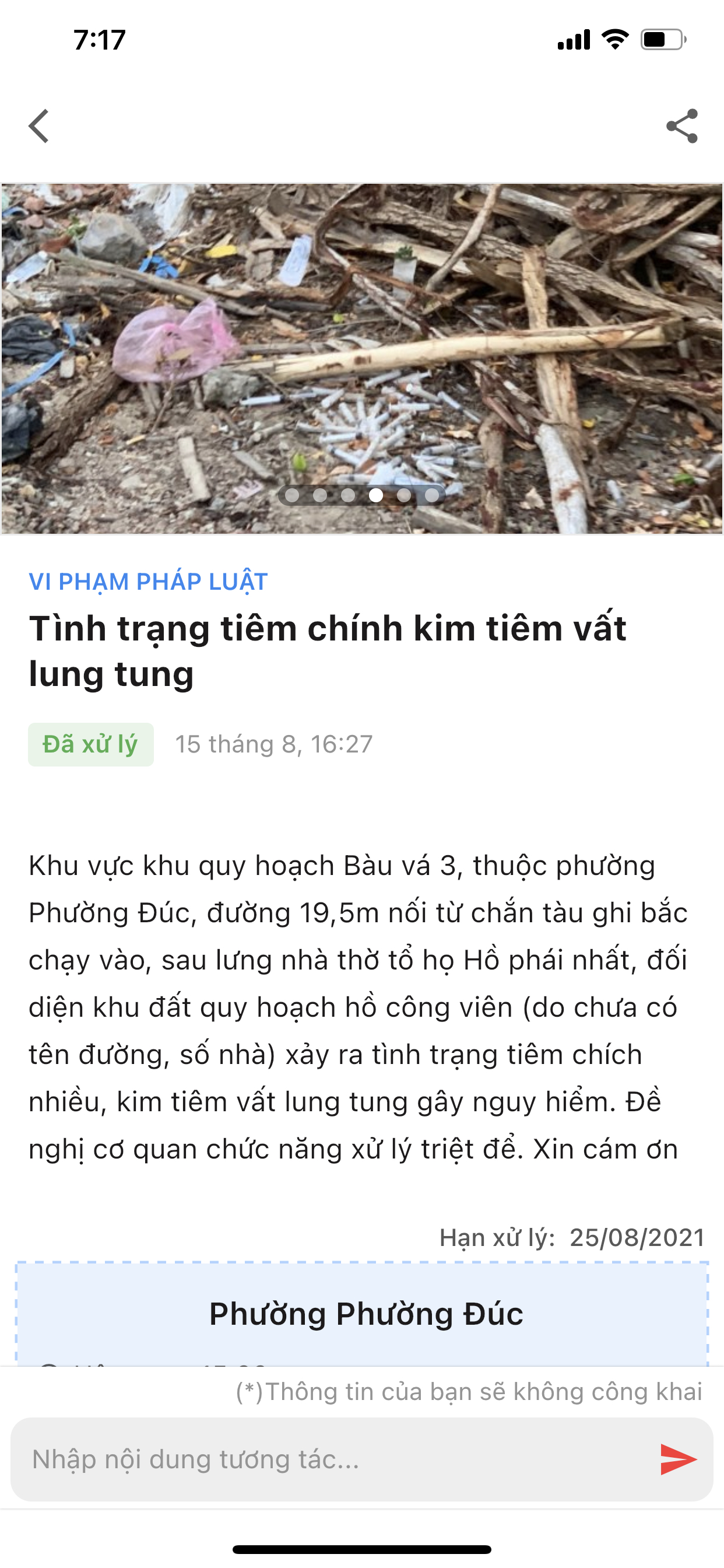 Sau khi nhận được phản ánh của Ông/Bà, UBND phường đã tổ chức lực lượng thu dọn bơm kim tiêm để đảm bảo an toàn cho người dân. (Đính kèm hình ảnh)