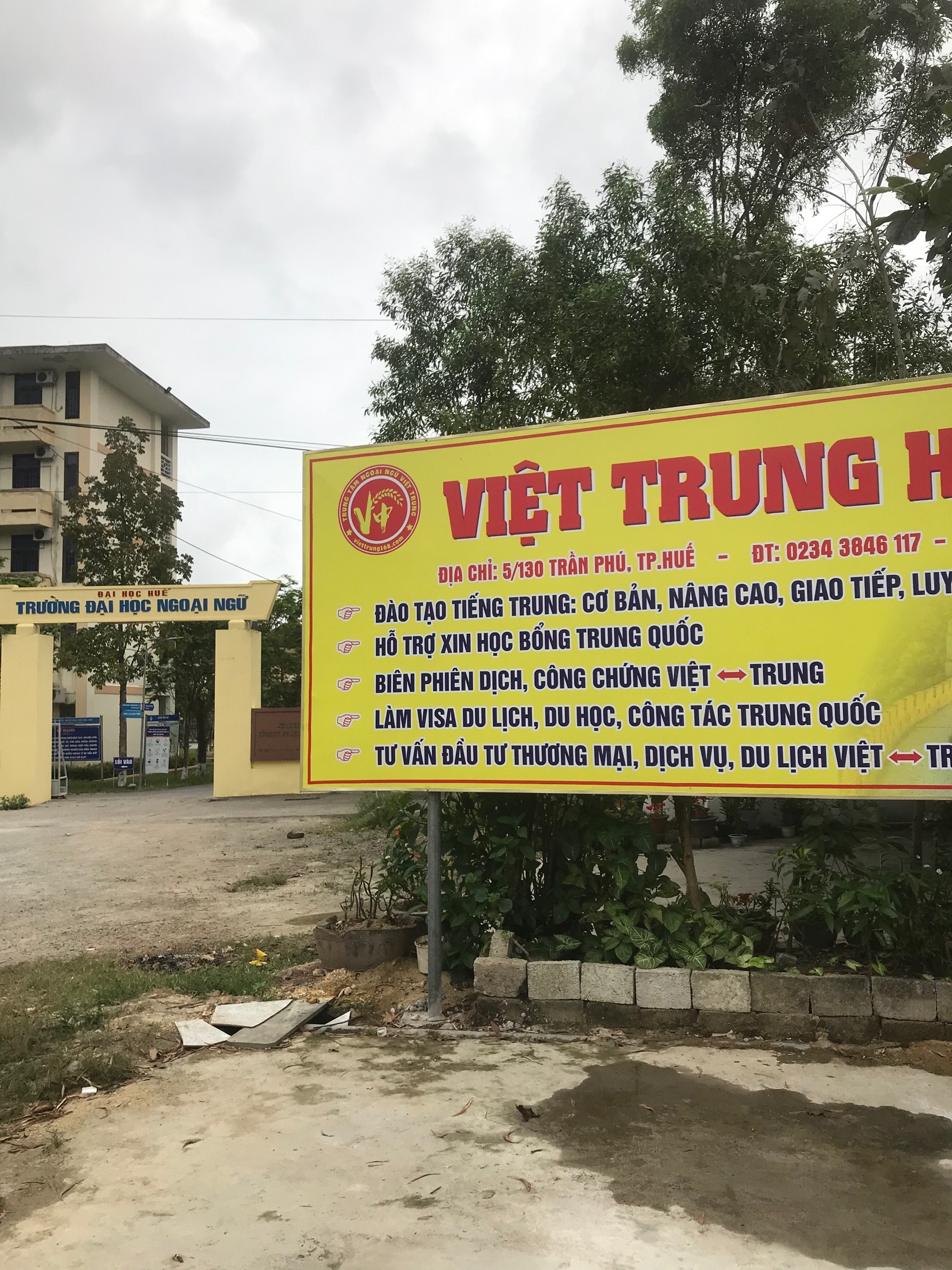 Trung tâm ngoại ngữ Việt Trung lắp biển quảng cáo trước mặt Trường Đại học Ngoại ngữ, Đại học Huế tại địa chỉ 57 Nguyễn Khoa Chiêm, thành phố Huế trên đất quy hoạch của Đại học Huế mà chưa được sự cho phép của Đại học Huế gây ảnh hưởng mỹ quan của Trường Đại học Ngoại ngữ và vi phạm quy định. Đề nghị cơ quan chức năng vào cuộc xử lý dứt điểm.