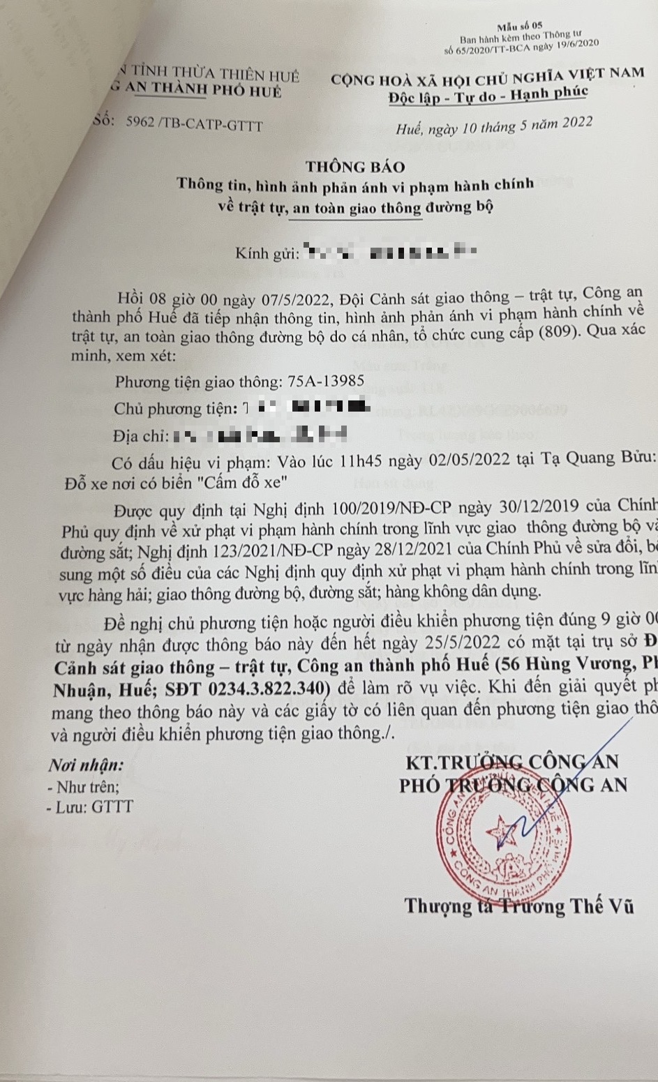 Đội Cảnh sát Giao thông - Trật tự Công an thành phố Huế đã tiến hành xác minh địa điểm phản ánh. Tại vị trí ngã ba đường Trần Quý Cáp & Tô Ngọc Vân, xe ô tô 75A13985 đã đỗ xe trước biển báo “Cấm đỗ xe” nên không vi phạm lỗi như đã phản ánh.