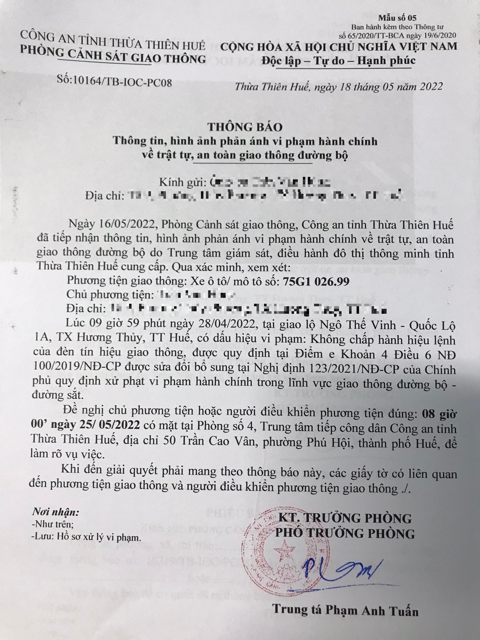 Vào lúc 09 giờ 59 phút ngày 28/04/2022, mô tô mang biển kiểm soát 75G102699 không chấp hành hiệu lệnh của đèn tín hiệu giao thông tại giao lộ Quốc Lộ 1A - Ngô Thế Vinh.