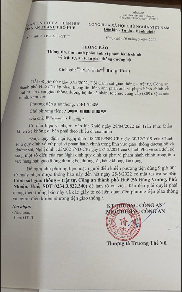 Vào lúc 07 giờ 46 phút ngày 28/04/2022 trên tuyến đường Trần Phú, xe mô tô mang biển kiểm soát 75F174486, điều khiển xe không đi bên phải theo chiều đi của mình.