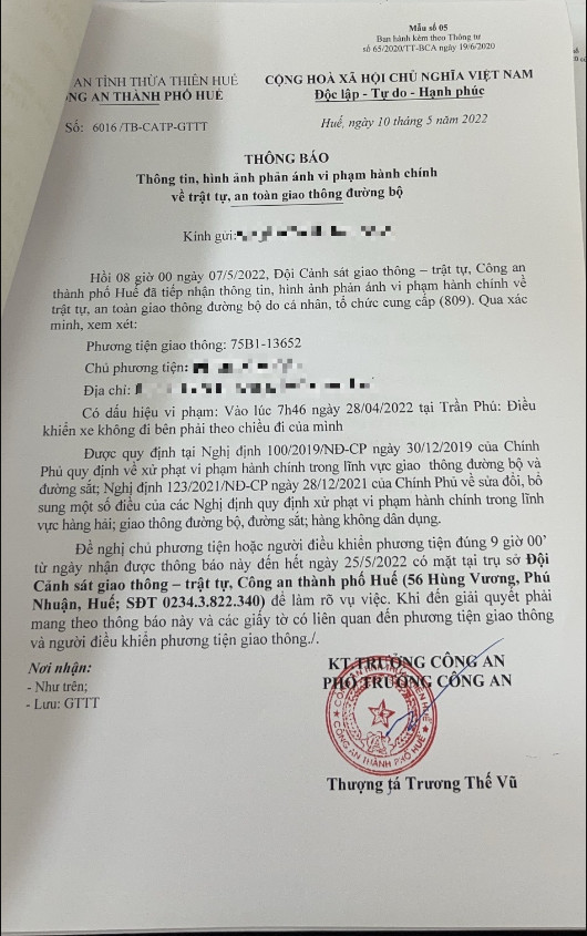 Vào lúc 07 giờ 46 phút ngày 28/04/2022 trên tuyến đường Trần Phú, xe mô tô mang biển kiểm soát 75B113652, điều khiển xe không đi bên phải theo chiều đi của mình.