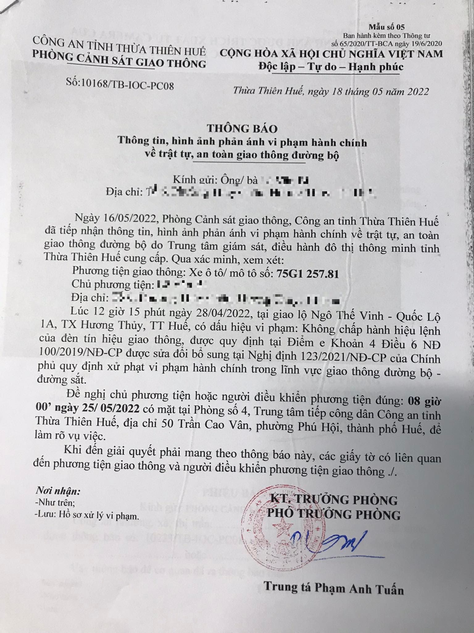 Vào lúc 12 giờ 15 phút ngày 28/04/2022, mô tô mang biển kiểm soát 75G125781 không chấp hành hiệu lệnh của đèn tín hiệu giao thông tại giao lộ Quốc Lộ 1A - Ngô Thế Vinh.