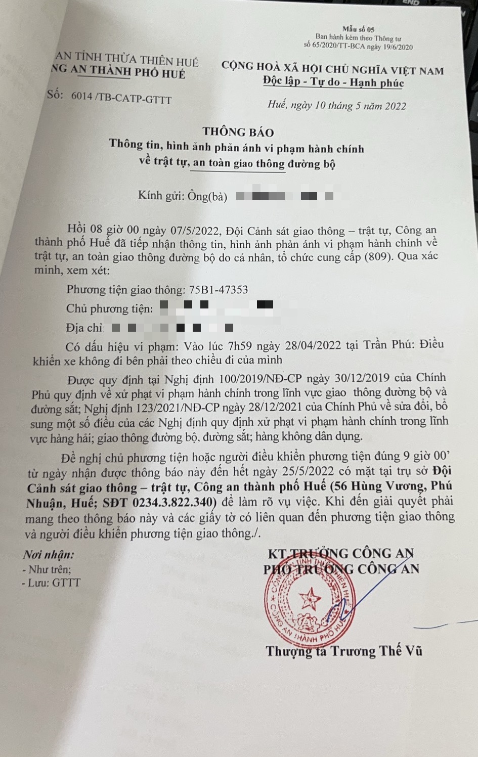 Công an thành phố đã lập hồ sơ, thông báo chủ phương tiện đến làm việc vào ngày 25/5/2022. Tuy nhiên, hiện chủ phương tiện vẫn chưa trình diện tại cơ quan. Công an thành phố Huế sẽ tiếp tục thông báo lực lượng tuần tra trên địa bàn, trong quá trình làm nhiệm vụ phát hiện, xử lý.