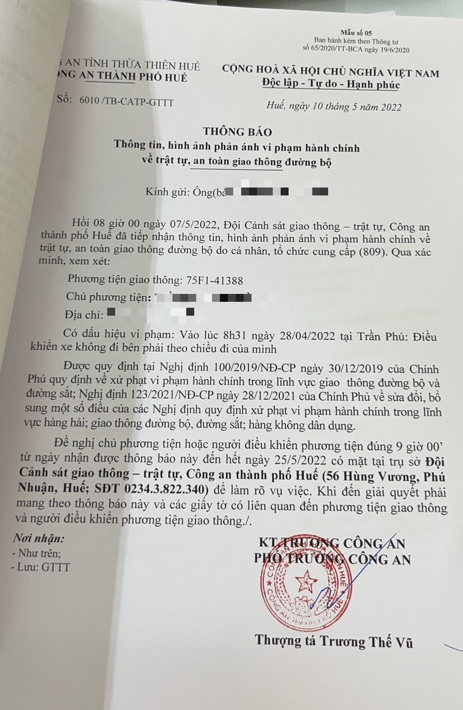 Công an thành phố đã lập hồ sơ, thông báo chủ phương tiện đến làm việc vào ngày 25/5/2022. Tuy nhiên, hiện chủ phương tiện vẫn chưa trình diện tại cơ quan. Công an thành phố Huế sẽ tiếp tục thông báo lực lượng tuần tra trên địa bàn, trong quá trình làm nhiệm vụ phát hiện, xử lý.