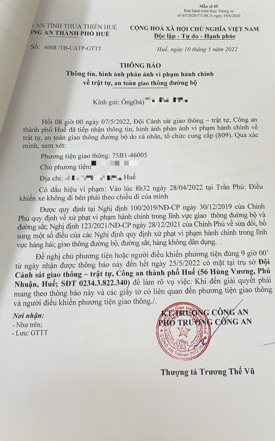 Công an thành phố đã lập hồ sơ, thông báo chủ phương tiện đến làm việc vào ngày 25/5/2022. Tuy nhiên, hiện chủ phương tiện vẫn chưa trình diện tại cơ quan. Công an thành phố Huế sẽ tiếp tục thông báo lực lượng tuần tra trên địa bàn, trong quá trình làm nhiệm vụ phát hiện, xử lý.