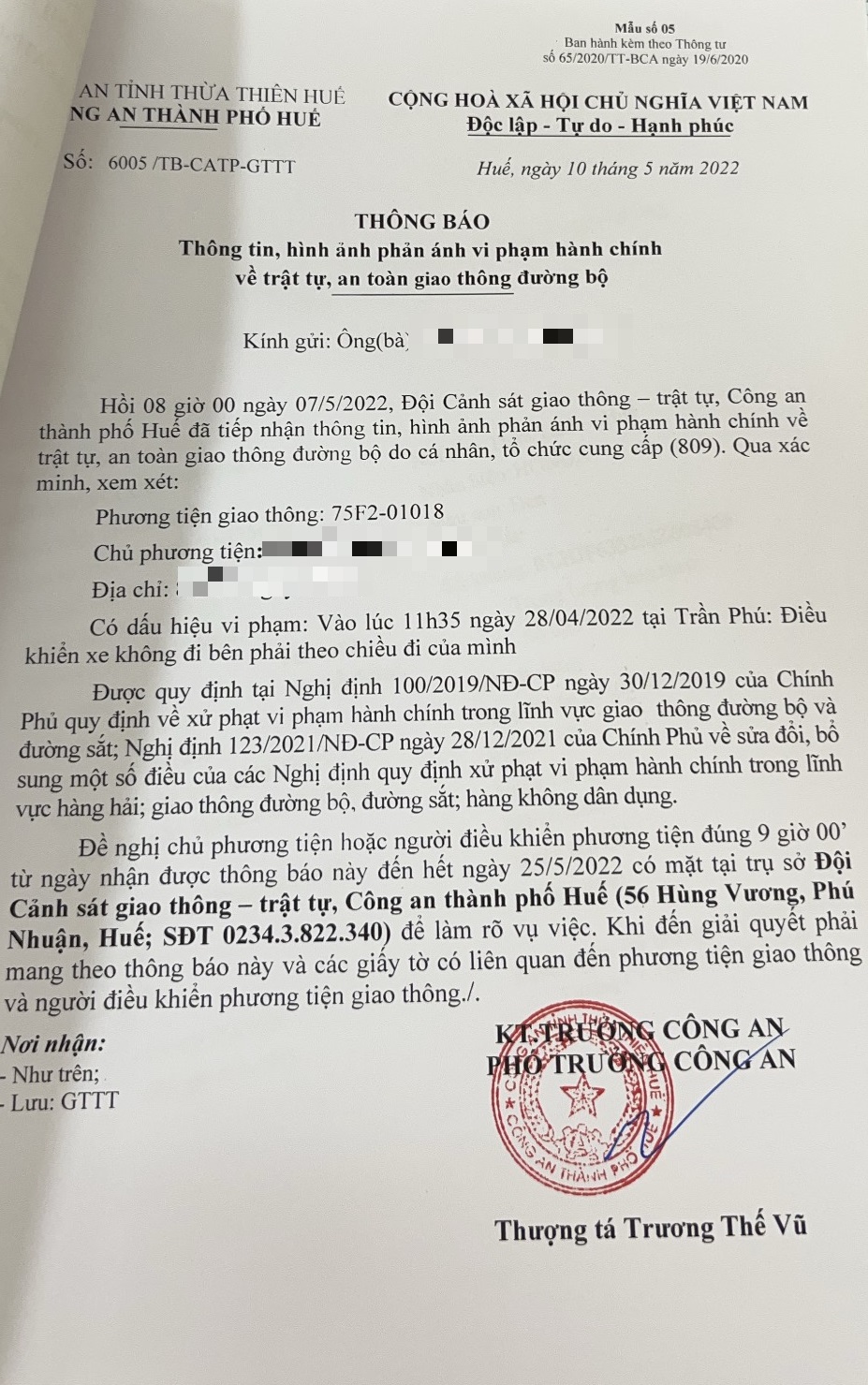 Công an thành phố đã lập hồ sơ, thông báo chủ phương tiện đến làm việc vào ngày 25/5/2022. Tuy nhiên, hiện chủ phương tiện vẫn chưa trình diện tại cơ quan. Công an thành phố Huế sẽ tiếp tục thông báo lực lượng tuần tra trên địa bàn, trong quá trình làm nhiệm vụ phát hiện, xử lý.