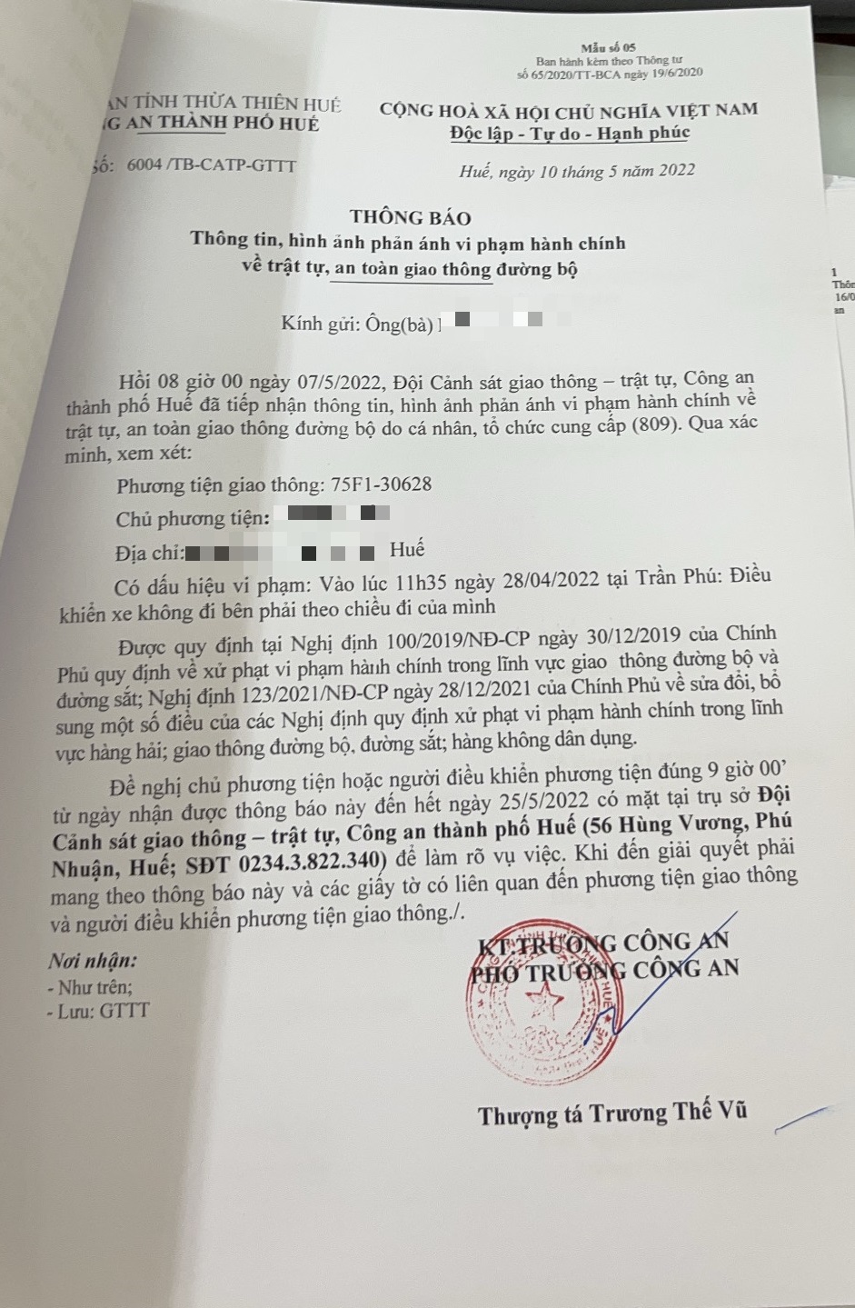 Công an thành phố đã lập hồ sơ, thông báo chủ phương tiện đến làm việc vào ngày 25/5/2022. Tuy nhiên, hiện chủ phương tiện vẫn chưa trình diện tại cơ quan. Công an thành phố Huế sẽ tiếp tục thông báo lực lượng tuần tra trên địa bàn, trong quá trình làm nhiệm vụ phát hiện, xử lý.