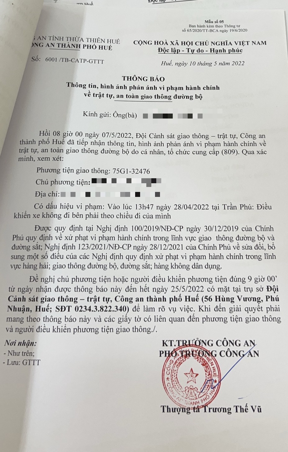 Công an thành phố đã lập hồ sơ, thông báo chủ phương tiện đến làm việc vào ngày 25/5/2022. Tuy nhiên, hiện chủ phương tiện vẫn chưa trình diện tại cơ quan. Công an thành phố Huế sẽ tiếp tục thông báo lực lượng tuần tra trên địa bàn, trong quá trình làm nhiệm vụ phát hiện, xử lý.