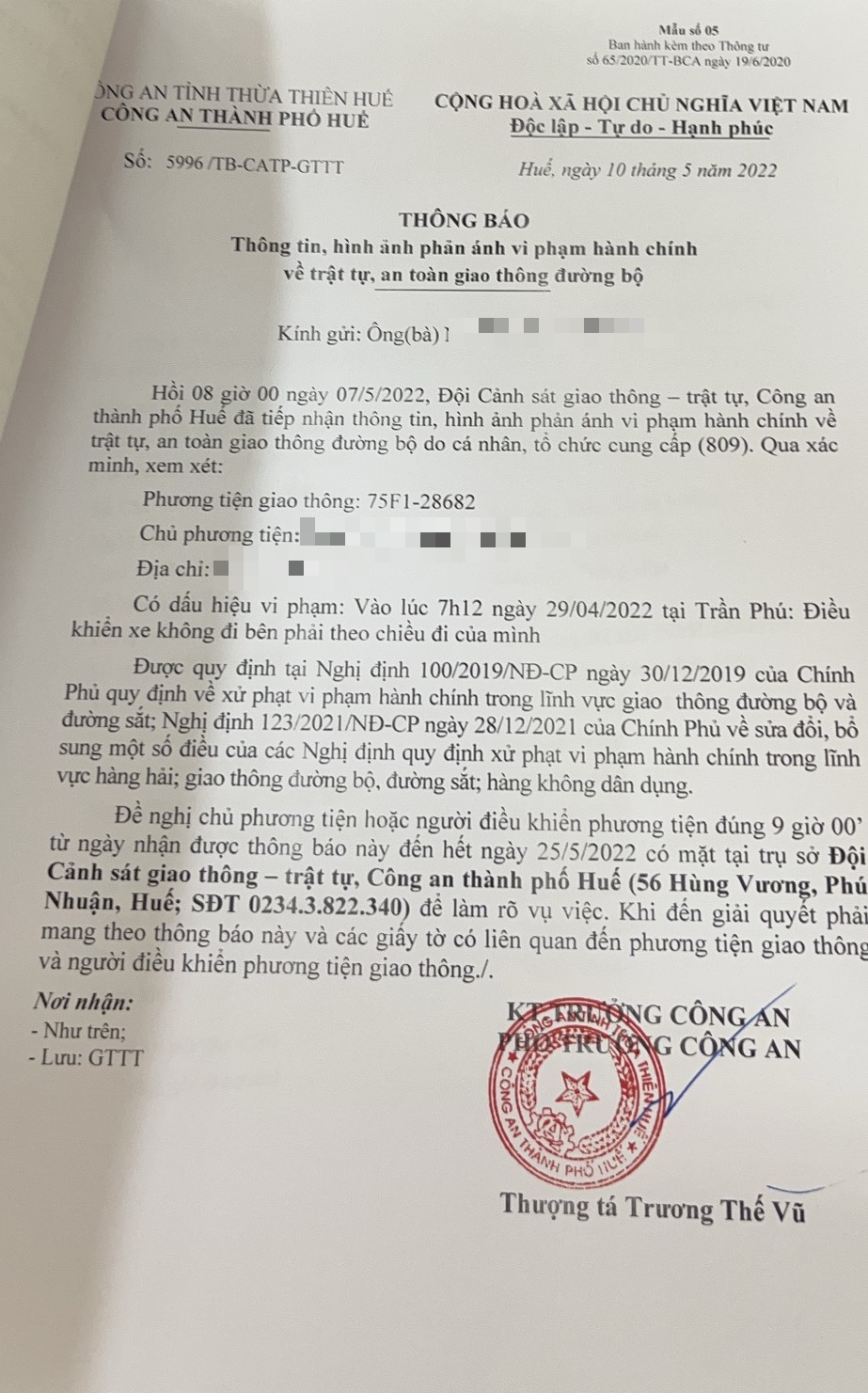 Công an thành phố đã lập hồ sơ, thông báo chủ phương tiện đến làm việc vào ngày 25/5/2022. Tuy nhiên, hiện chủ phương tiện vẫn chưa trình diện tại cơ quan. Công an thành phố Huế sẽ tiếp tục thông báo lực lượng tuần tra trên địa bàn, trong quá trình làm nhiệm vụ phát hiện, xử lý.