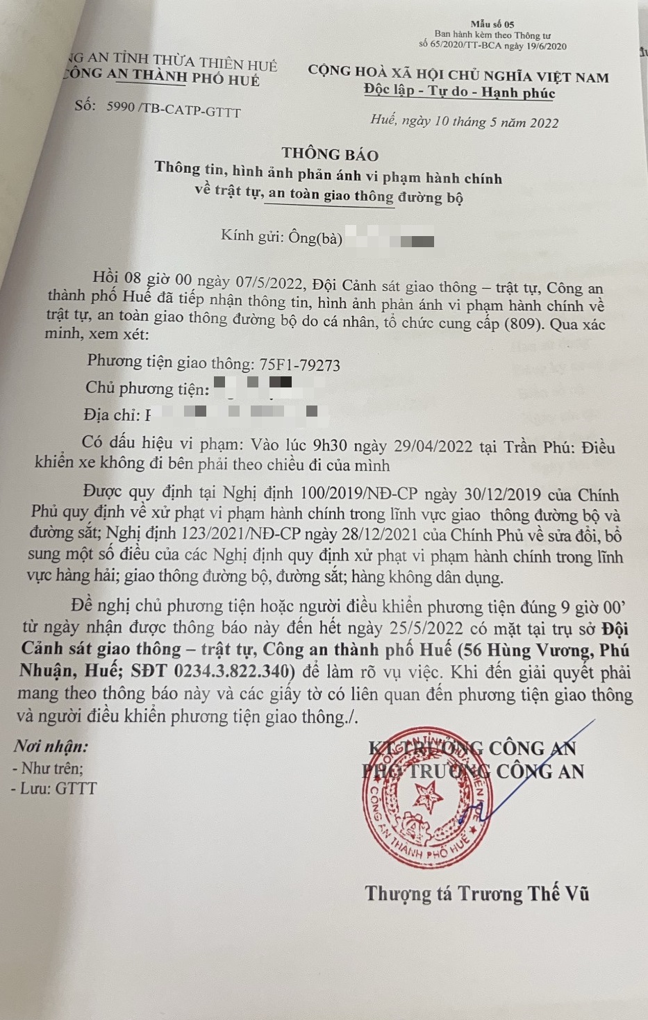 Công an thành phố đã lập hồ sơ, thông báo chủ phương tiện đến làm việc vào ngày 25/5/2022. Tuy nhiên, hiện chủ phương tiện vẫn chưa trình diện tại cơ quan. Công an thành phố Huế sẽ tiếp tục thông báo lực lượng tuần tra trên địa bàn, trong quá trình làm nhiệm vụ phát hiện, xử lý.