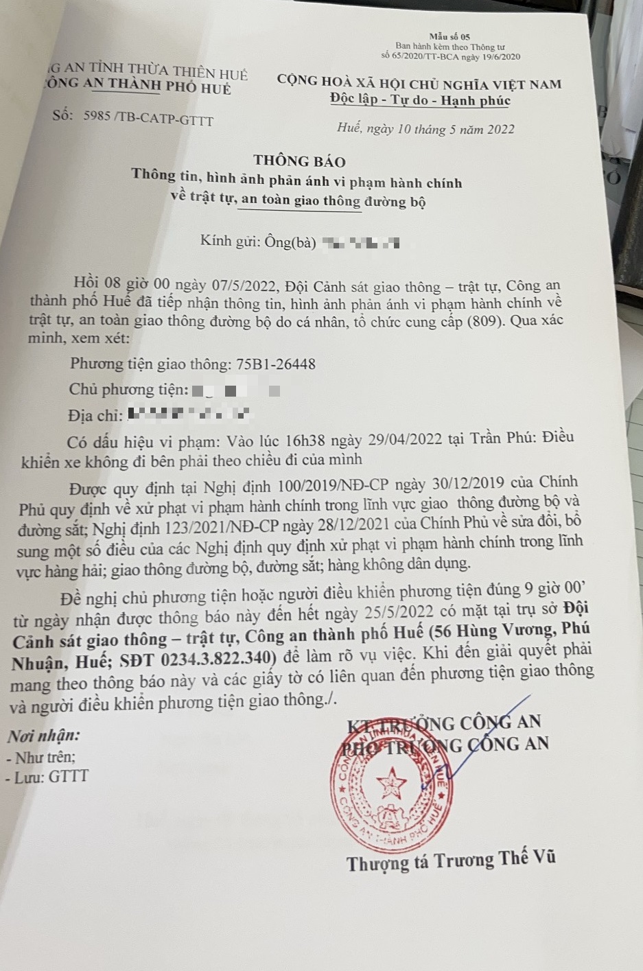 Công an thành phố đã lập hồ sơ, thông báo chủ phương tiện đến làm việc vào ngày 25/5/2022. Tuy nhiên, hiện chủ phương tiện vẫn chưa trình diện tại cơ quan. Công an thành phố Huế sẽ tiếp tục thông báo lực lượng tuần tra trên địa bàn, trong quá trình làm nhiệm vụ phát hiện, xử lý.