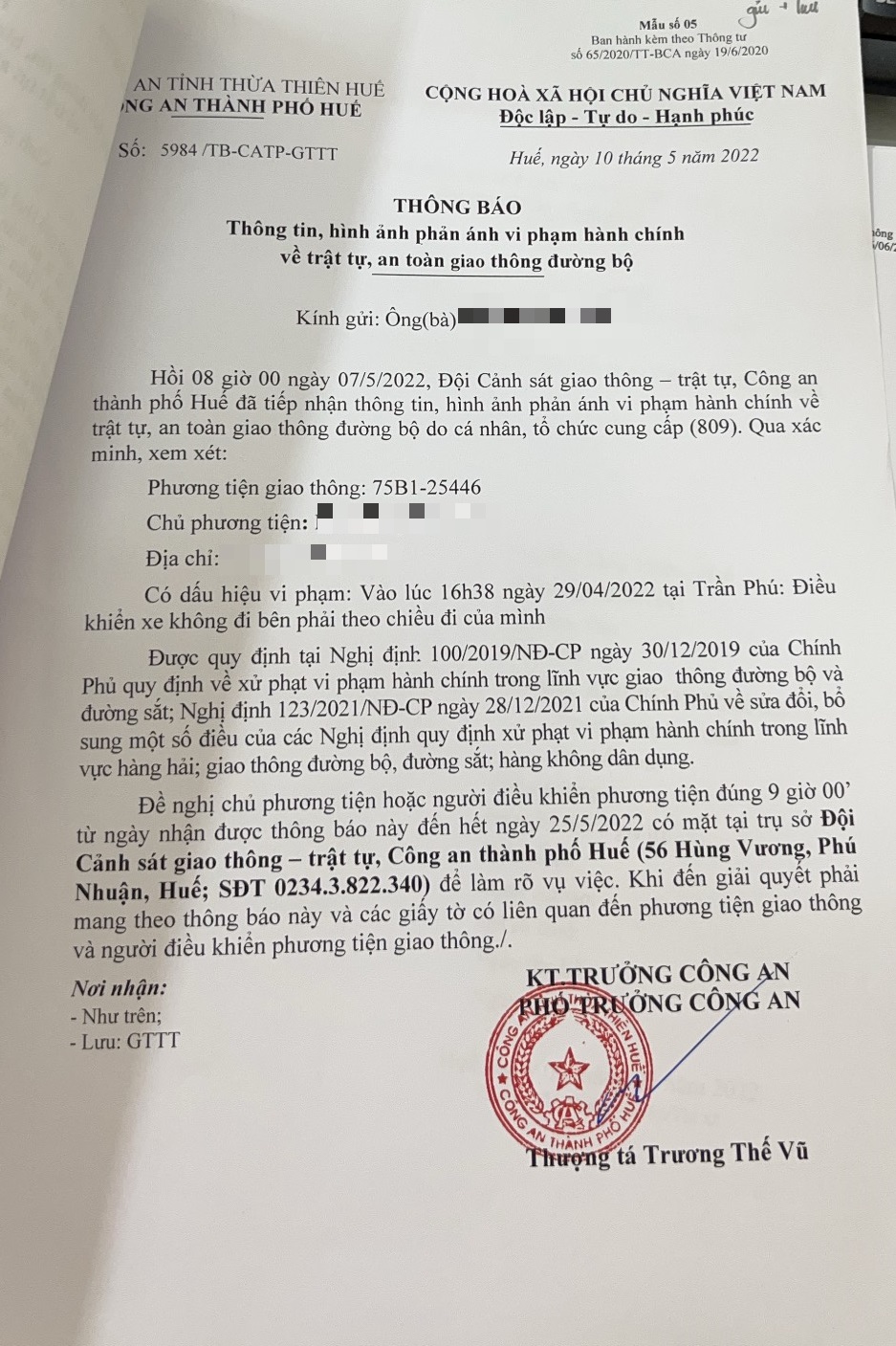 Công an thành phố đã lập hồ sơ, thông báo chủ phương tiện đến làm việc vào ngày 25/5/2022. Tuy nhiên, hiện chủ phương tiện vẫn chưa trình diện tại cơ quan. Công an thành phố Huế sẽ tiếp tục thông báo lực lượng tuần tra trên địa bàn, trong quá trình làm nhiệm vụ phát hiện, xử lý.