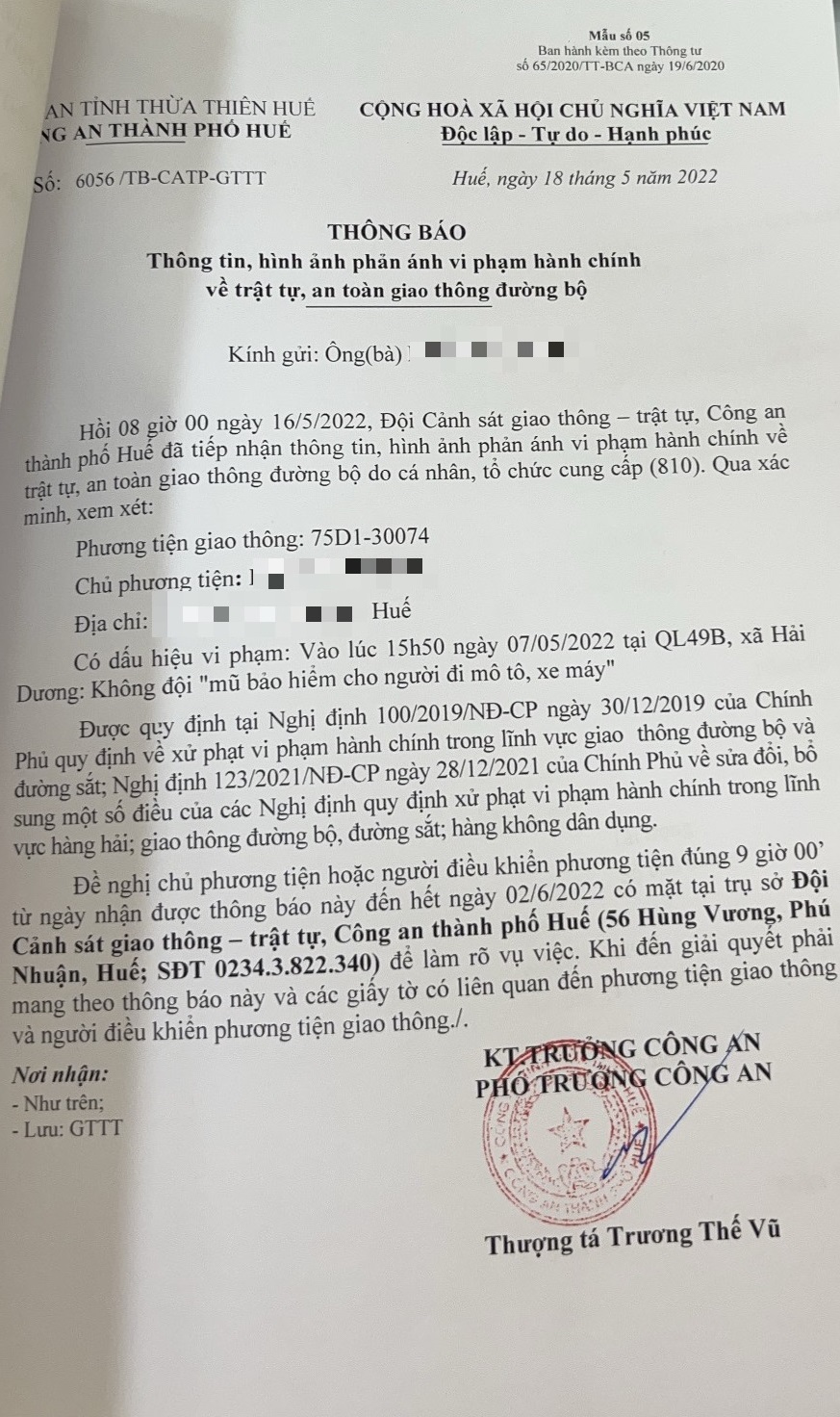 Công an thành phố đã lập hồ sơ, thông báo chủ phương tiện đến làm việc vào ngày 02/6/2022. Tuy nhiên, hiện chủ phương tiện vẫn chưa trình diện tại cơ quan. Công an thành phố Huế sẽ tiếp tục thông báo lực lượng tuần tra trên địa bàn, trong quá trình làm nhiệm vụ phát hiện, xử lý.