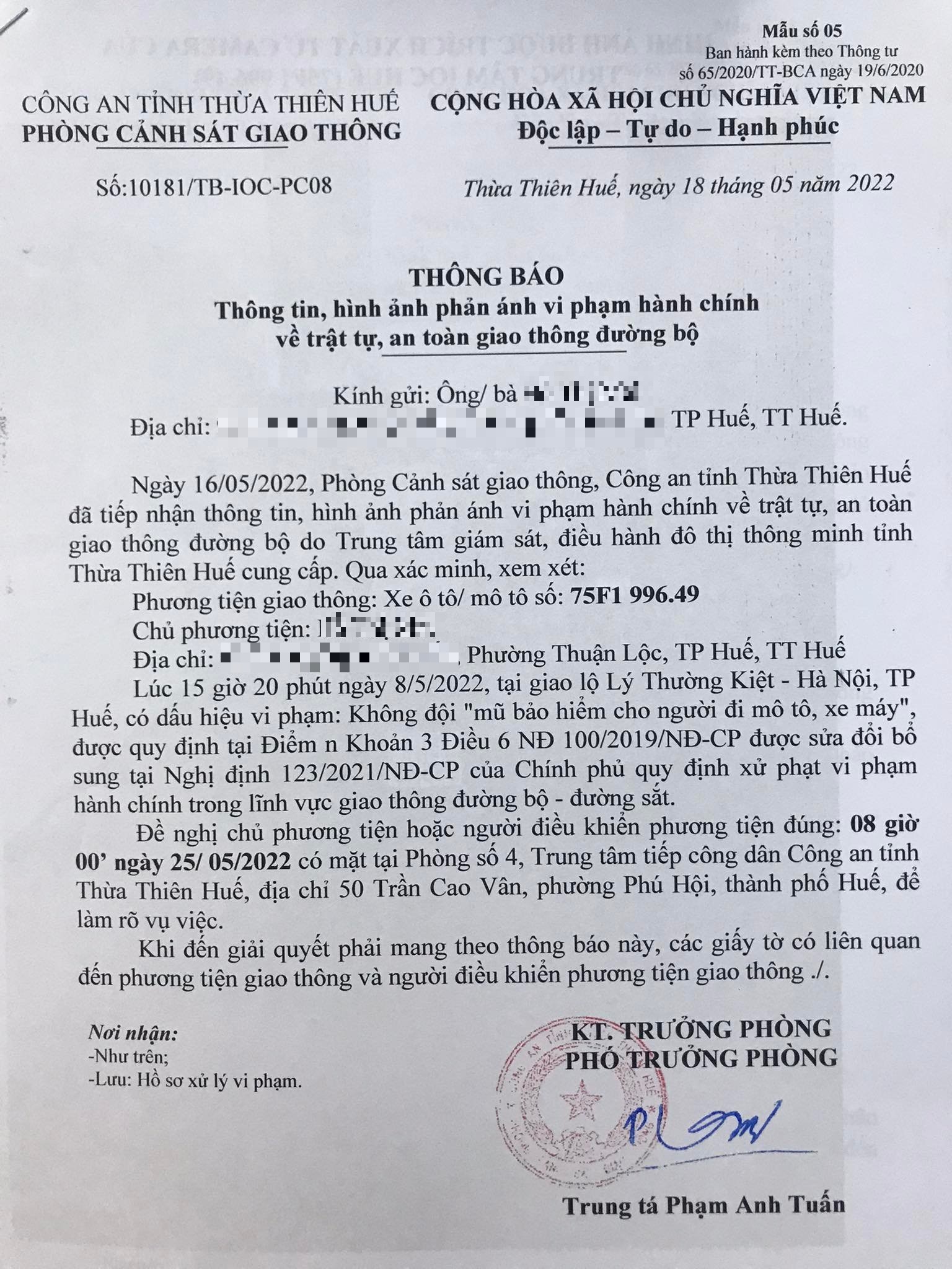 Phòng Cảnh sát giao thông đã gửi thông báo, yêu cầu chủ phương tiện đến làm việc vào ngày 25/5/2022. Tuy nhiên, hiện chủ phương tiện vẫn chưa trình diện tại cơ quan. Phòng Cảnh sát giao thông sẽ tiếp tục thông báo Công an địa phương nơi chủ phương tiện thường trú; đồng thời, thông báo các tổ tuần tra kiểm soát trên địa bàn, trong quá trình làm nhiệm vụ nếu phát hiện sẽ tiến hành dừng xe để xử lý.