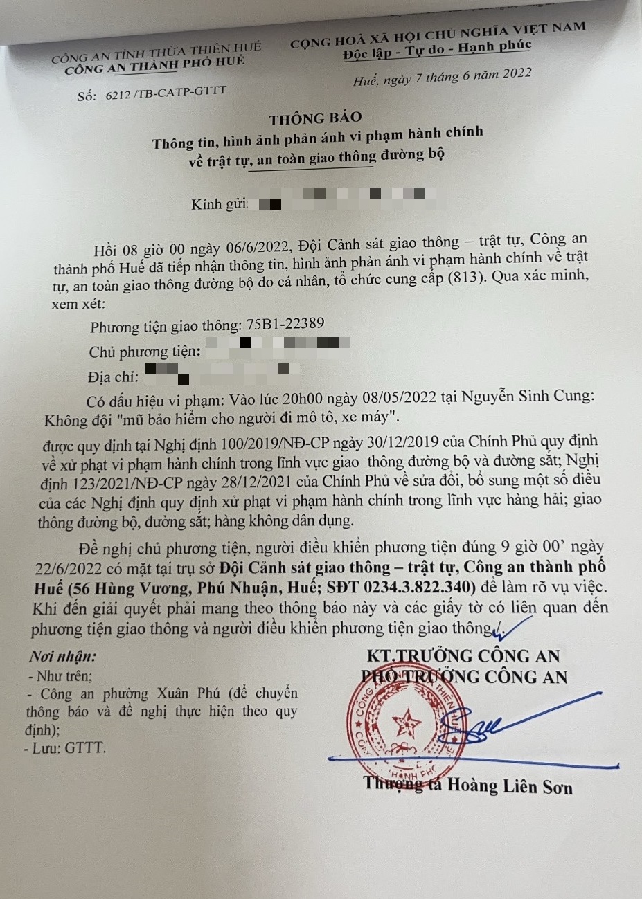 ông an thành phố đã lập hồ sơ, thông báo chủ phương tiện đến làm việc vào ngày 22/6/2022. Tuy nhiên, hiện chủ phương tiện vẫn chưa trình diện tại cơ quan. Công an thành phố Huế sẽ tiếp tục thông báo lực lượng tuần tra trên địa bàn, trong quá trình làm nhiệm vụ phát hiện, xử lý.