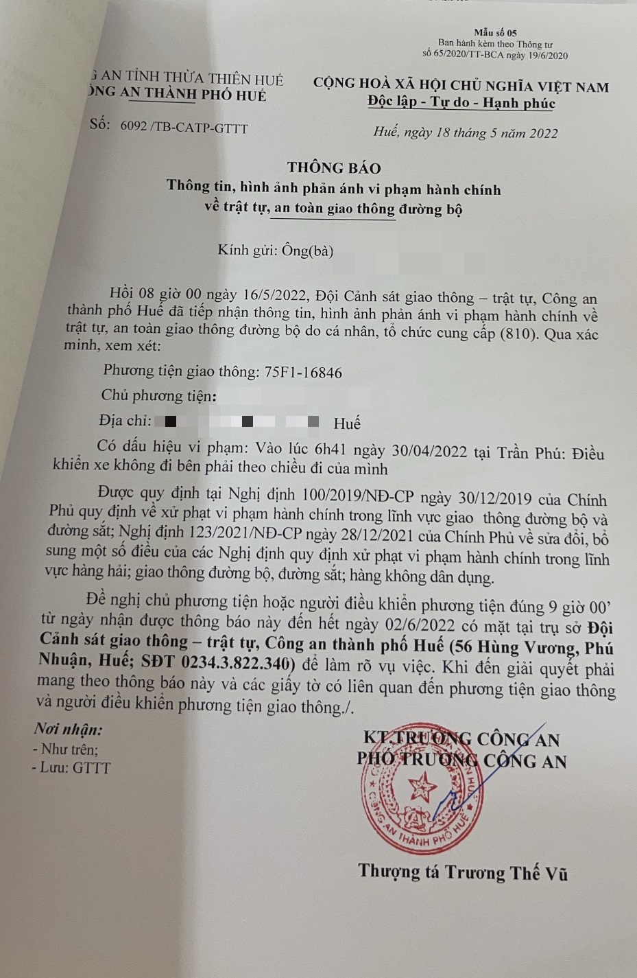 Công an thành phố đã lập hồ sơ, thông báo chủ phương tiện đến làm việc vào ngày 02/6/2022. Tuy nhiên, hiện chủ phương tiện vẫn chưa trình diện tại cơ quan. Công an thành phố Huế sẽ tiếp tục thông báo lực lượng tuần tra trên địa bàn, trong quá trình làm nhiệm vụ phát hiện, xử lý.