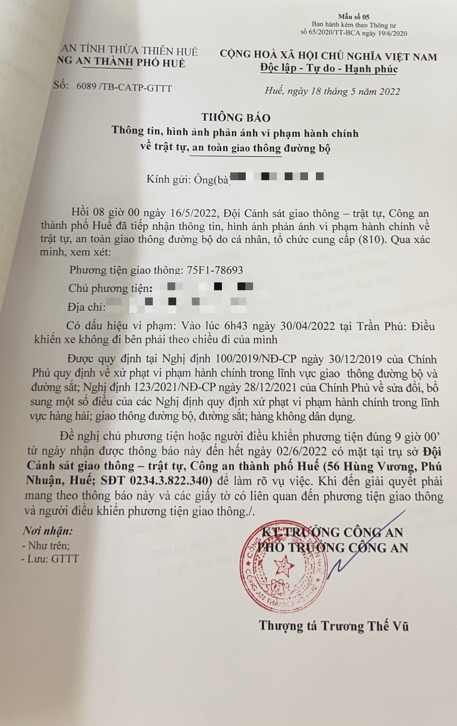Công an thành phố đã lập hồ sơ, thông báo chủ phương tiện đến làm việc vào ngày 02/6/2022. Tuy nhiên, hiện chủ phương tiện vẫn chưa trình diện tại cơ quan. Công an thành phố Huế sẽ tiếp tục thông báo lực lượng tuần tra trên địa bàn, trong quá trình làm nhiệm vụ phát hiện, xử lý.