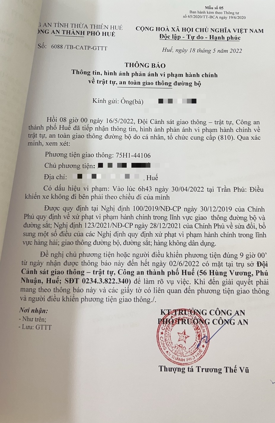 Công an thành phố đã lập hồ sơ, thông báo chủ phương tiện đến làm việc vào ngày 02/6/2022. Tuy nhiên, hiện chủ phương tiện vẫn chưa trình diện tại cơ quan. Công an thành phố Huế sẽ tiếp tục thông báo lực lượng tuần tra trên địa bàn, trong quá trình làm nhiệm vụ phát hiện, xử lý.