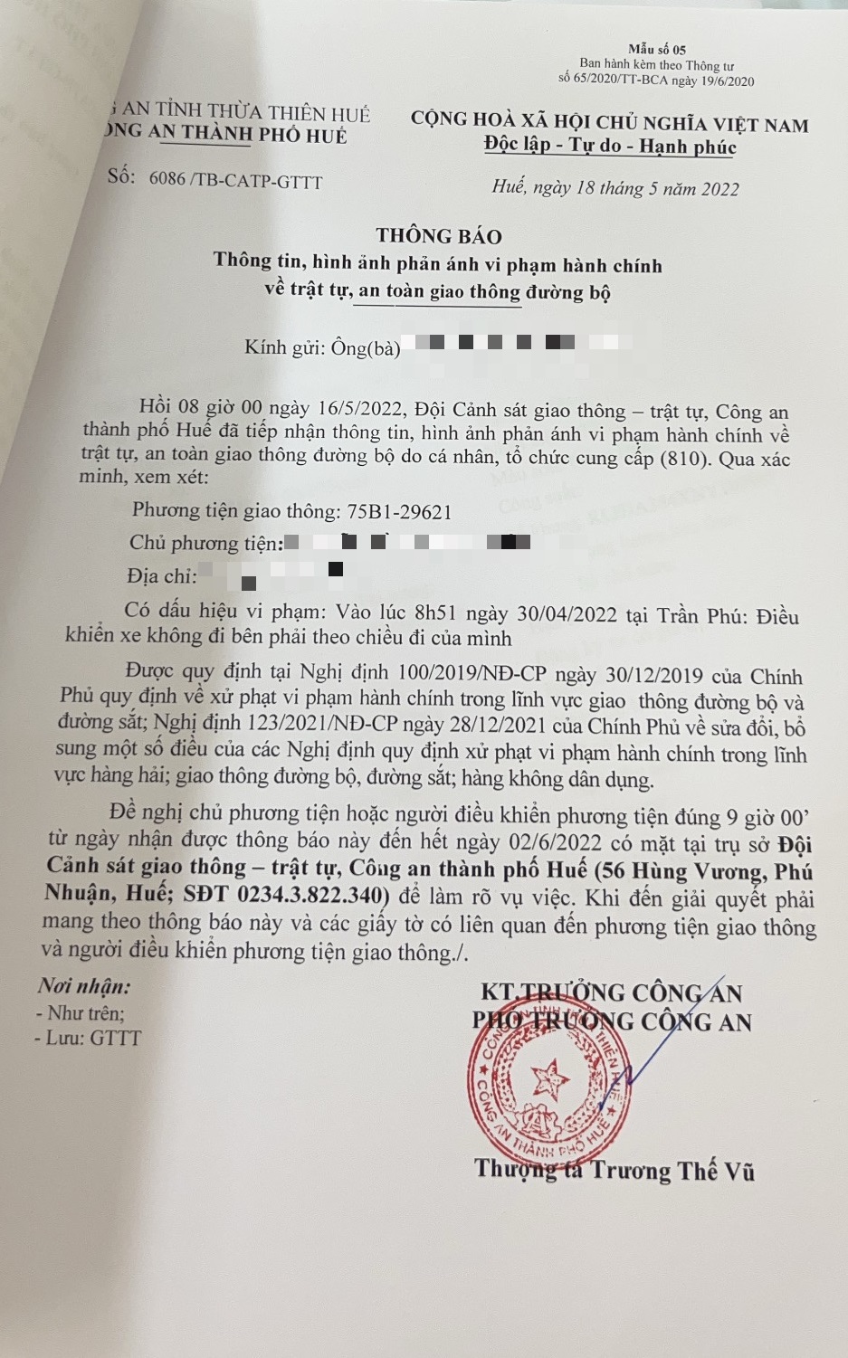 Công an thành phố đã lập hồ sơ, thông báo chủ phương tiện đến làm việc vào ngày 02/6/2022. Tuy nhiên, hiện chủ phương tiện vẫn chưa trình diện tại cơ quan. Công an thành phố Huế sẽ tiếp tục thông báo lực lượng tuần tra trên địa bàn, trong quá trình làm nhiệm vụ phát hiện, xử lý.