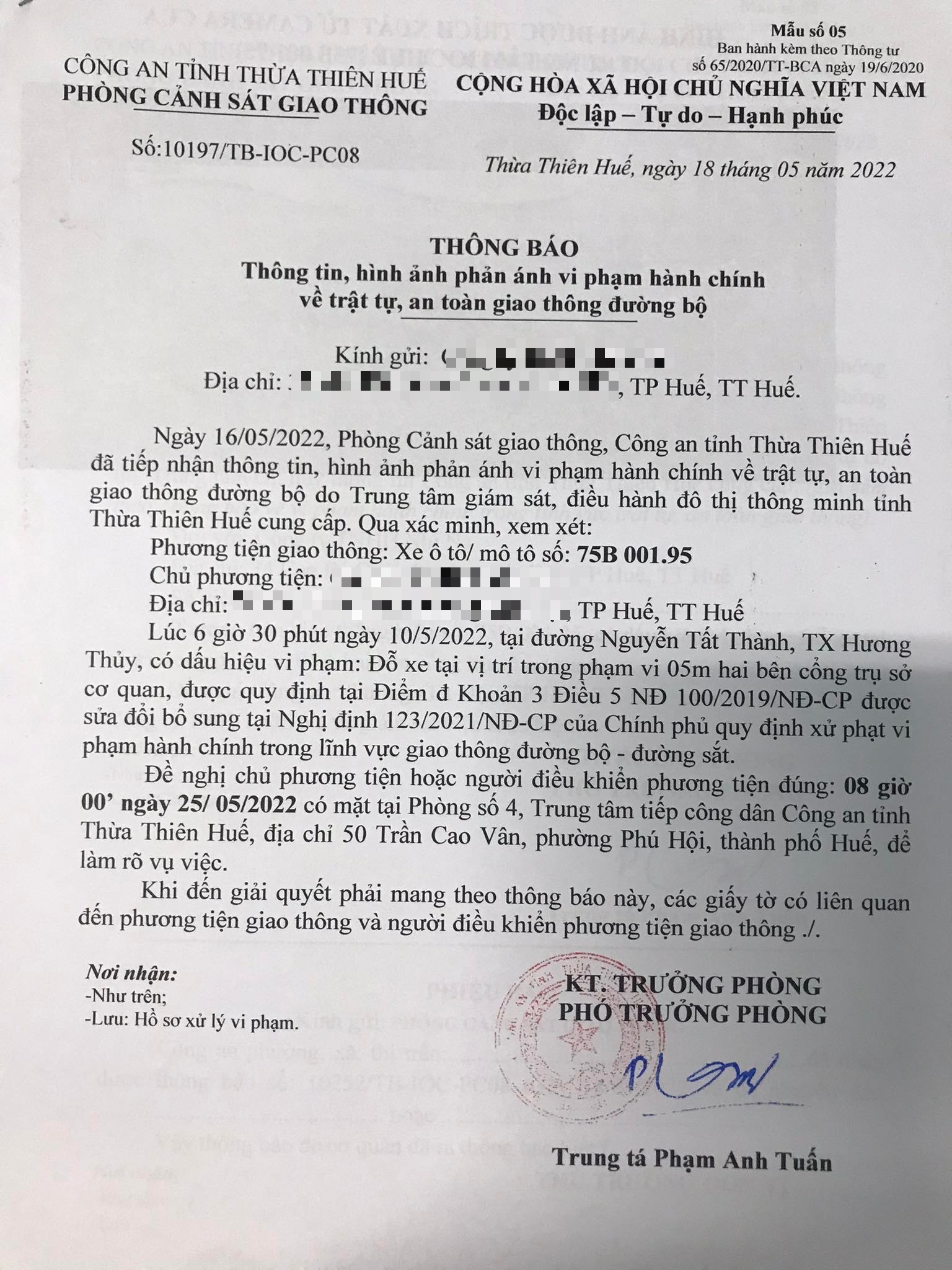 Phòng CSGT đã lập hồ sơ, thông báo chủ phương tiện đến làm việc vào ngày 25/5/2022. Tuy nhiên, hiện chủ phương tiện vẫn chưa trình diện tại cơ quan. Phòng CSGT sẽ gửi thông báo cho cơ quan đăng kiểm để đưa phương tiện vào cảnh báo trên Chương trình Quản lý kiểm định.
