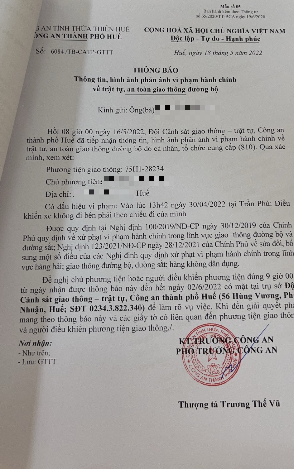 Công an thành phố đã lập hồ sơ, thông báo chủ phương tiện đến làm việc vào ngày 02/6/2022. Tuy nhiên, hiện chủ phương tiện vẫn chưa trình diện tại cơ quan. Công an thành phố Huế sẽ tiếp tục thông báo lực lượng tuần tra trên địa bàn, trong quá trình làm nhiệm vụ phát hiện, xử lý.
