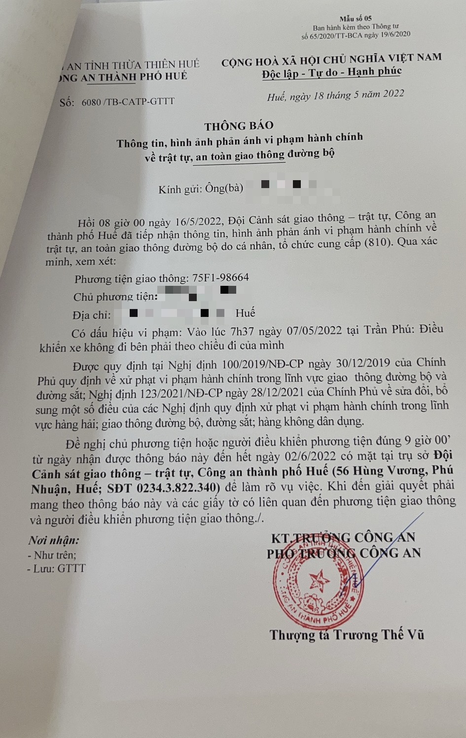 Công an thành phố đã lập hồ sơ, thông báo chủ phương tiện đến làm việc vào ngày 02/6/2022. Tuy nhiên, hiện chủ phương tiện vẫn chưa trình diện tại cơ quan. Công an thành phố Huế sẽ tiếp tục thông báo lực lượng tuần tra trên địa bàn, trong quá trình làm nhiệm vụ phát hiện, xử lý.