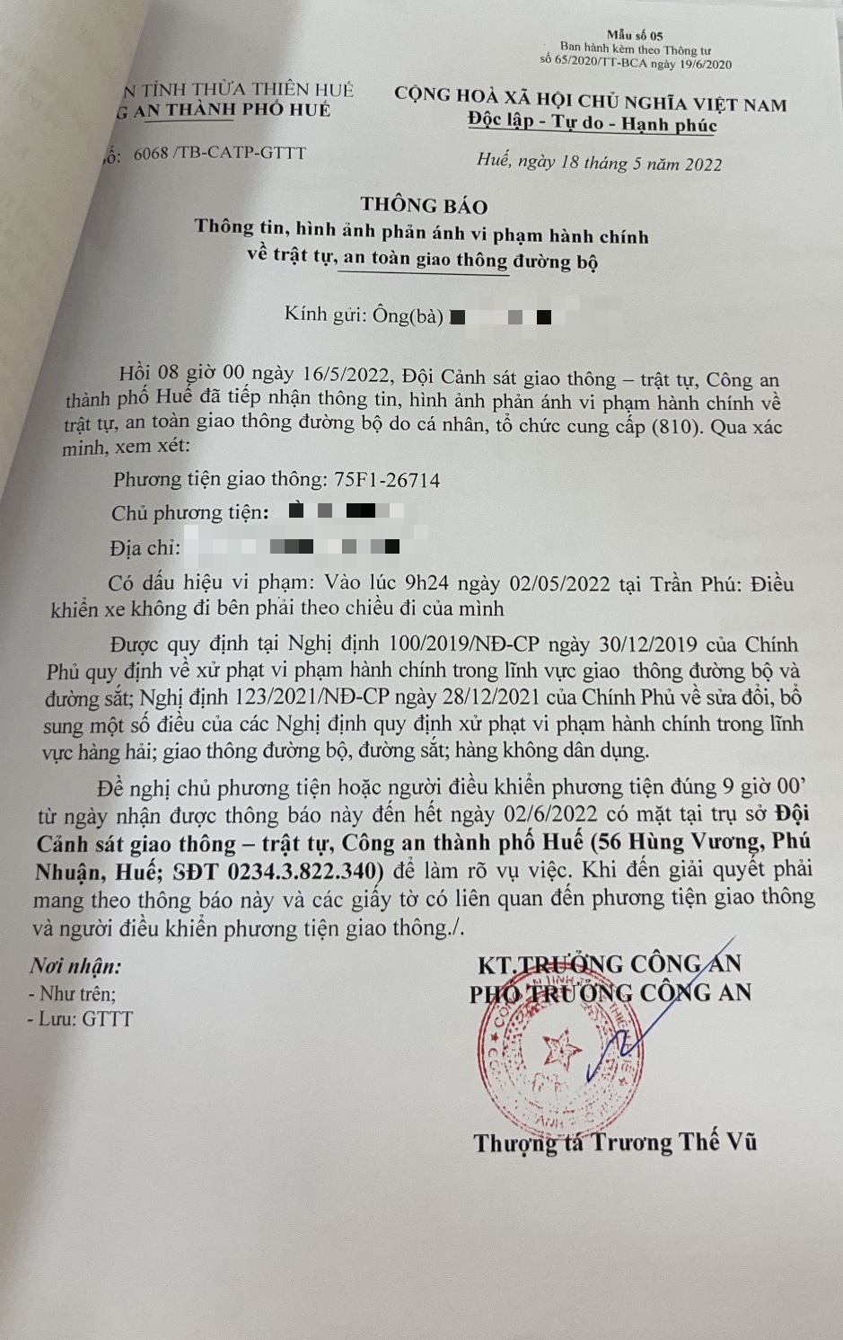 Công an thành phố đã lập hồ sơ, thông báo chủ phương tiện đến làm việc vào ngày 02/6/2022. Tuy nhiên, hiện chủ phương tiện vẫn chưa trình diện tại cơ quan. Công an thành phố Huế sẽ tiếp tục thông báo lực lượng tuần tra trên địa bàn, trong quá trình làm nhiệm vụ phát hiện, xử lý.