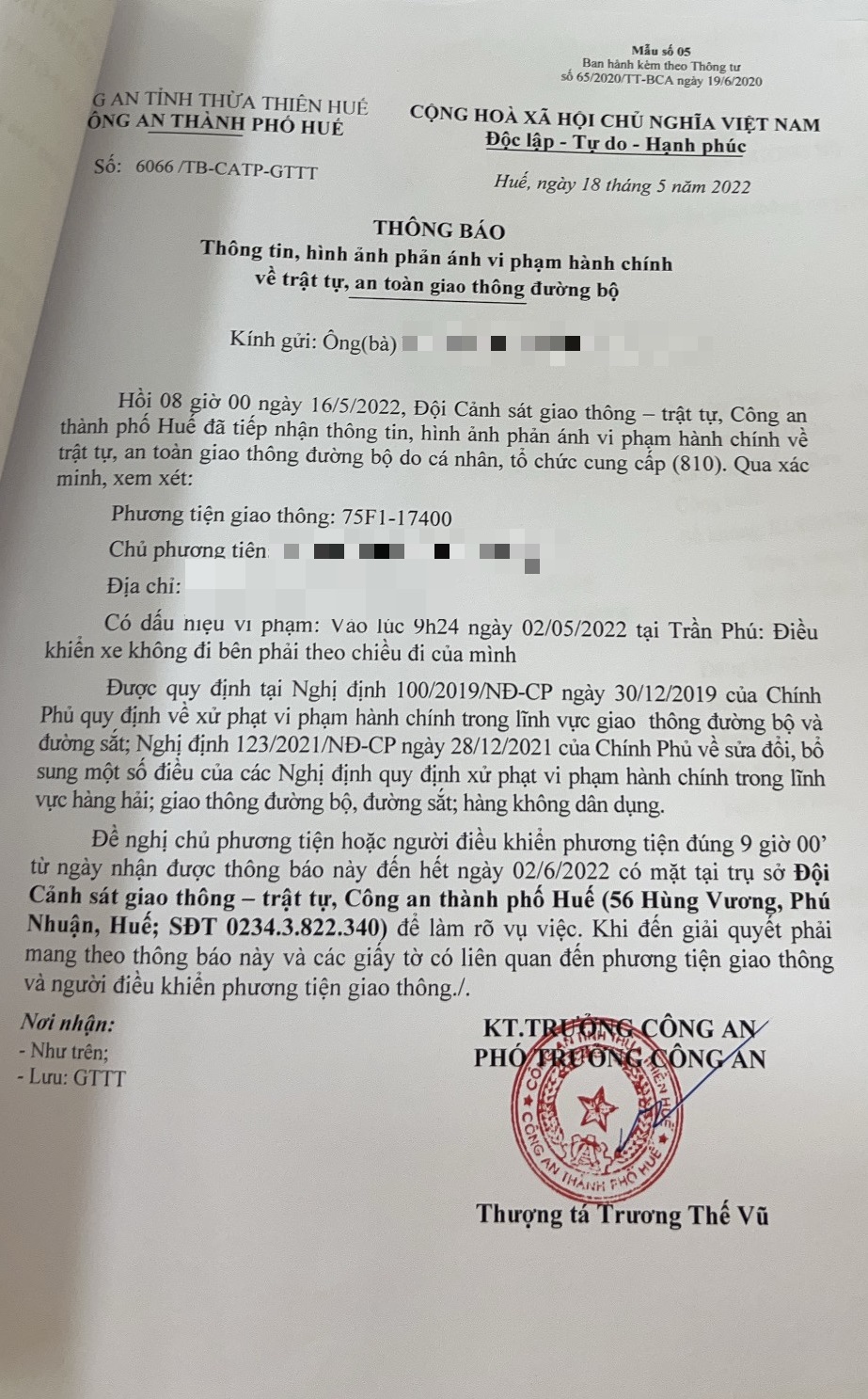 Công an thành phố đã lập hồ sơ, thông báo chủ phương tiện đến làm việc vào ngày 02/6/2022. Tuy nhiên, hiện chủ phương tiện vẫn chưa trình diện tại cơ quan. Công an thành phố Huế sẽ tiếp tục thông báo lực lượng tuần tra trên địa bàn, trong quá trình làm nhiệm vụ phát hiện, xử lý.