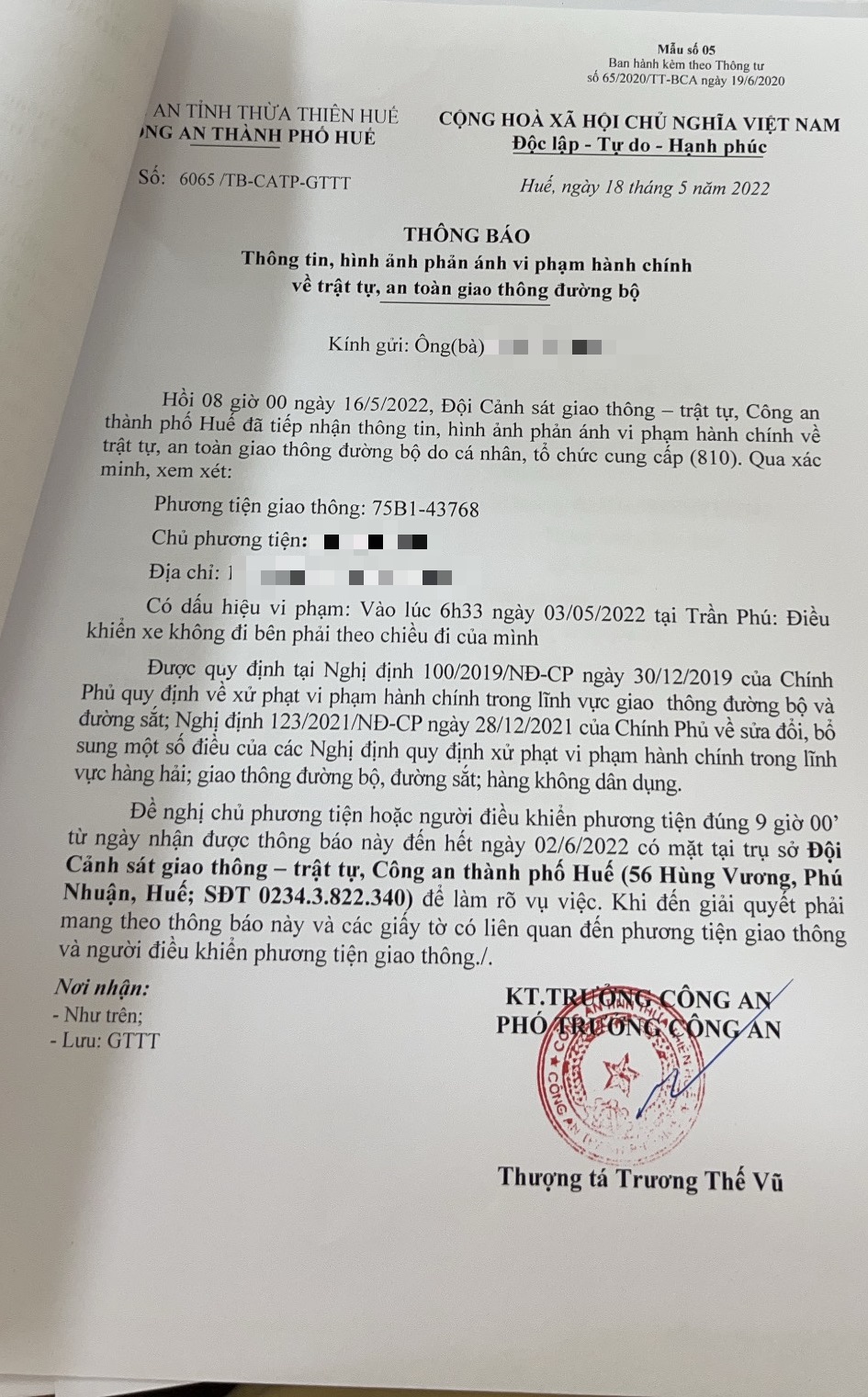Công an thành phố đã lập hồ sơ, thông báo chủ phương tiện đến làm việc vào ngày 02/6/2022. Tuy nhiên, hiện chủ phương tiện vẫn chưa trình diện tại cơ quan. Công an thành phố Huế sẽ tiếp tục thông báo lực lượng tuần tra trên địa bàn, trong quá trình làm nhiệm vụ phát hiện, xử lý.